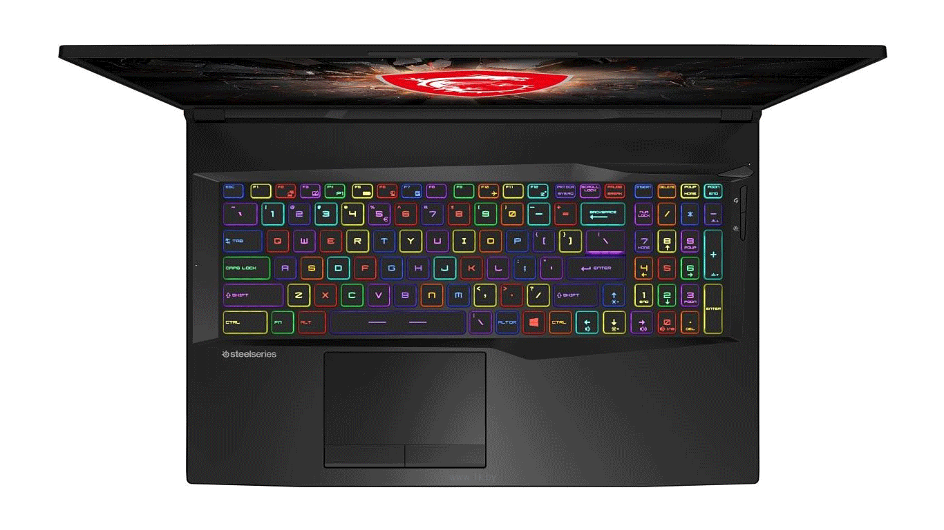 Как и более дорогие модели ноутбуков MSI, GL75 9SDK оборудован удобной полноразмерной клавиатурой от SteelSeries с RGB подсветкой. Печатать и играть на ней одно удовольствие. Раскладка достаточно хорошая, присутствует лишь один нюанс: клавиша Win размещена справа, а не слева, что может быть неудобно вне игр. Клавиша Delete для удобства отодвинута от основной части клавиатуры, а размеры клавиш чуть меньше стандарта, из-за чего количество ошибок ввода возрастает. В правом верхнем углу над цифровой панелью есть кнопка включения с индикатором, ниже кнопка смены подсветки клавиатуры, а под ней — включение турборежима работы вентиляторов. Тачпад утоплен в корпус, сенсорная площадка (12.1 х 6.4 см) в достаточной степени гладкая и хорошо скользит под пальцами. Правда, точность позиционирования не лучшая — для точного передвижения курсора приходится сильнее давить на площадку.