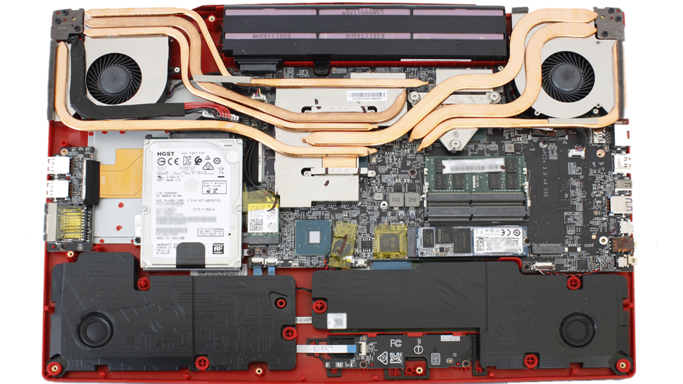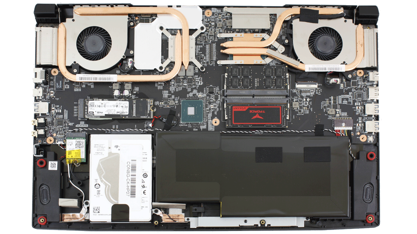 Возможность обслуживания и апгрейда имеется, но сделать это не так уж и легко. Дно удерживают на месте тринадцать винтиков, открутив которые, нужно еще разобраться с тугими защелками. Снятие крышки дает доступ к двум гнездам RAM, накопителю на шине NVMe, адаптеру беспроводной сети и пустой площадке 2.5″ SATA. Пользователь сможет также самостоятельно снять систему охлаждения с процессора и видеокарты для замены термопасты.