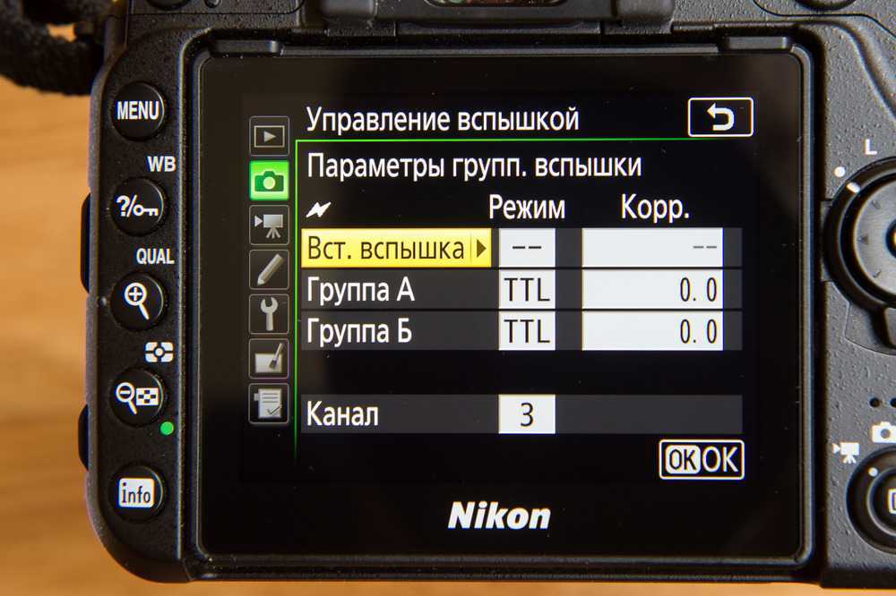 Пункт «Управление вспышкой» перебрался в раздел «Меню режимов фотосъёмки». Камера способна управлять двумя группами вспышек по четырём каналам. Для каждой группы, в том числе для встроенной вспышки, можно выбрать отдельный режим работы.