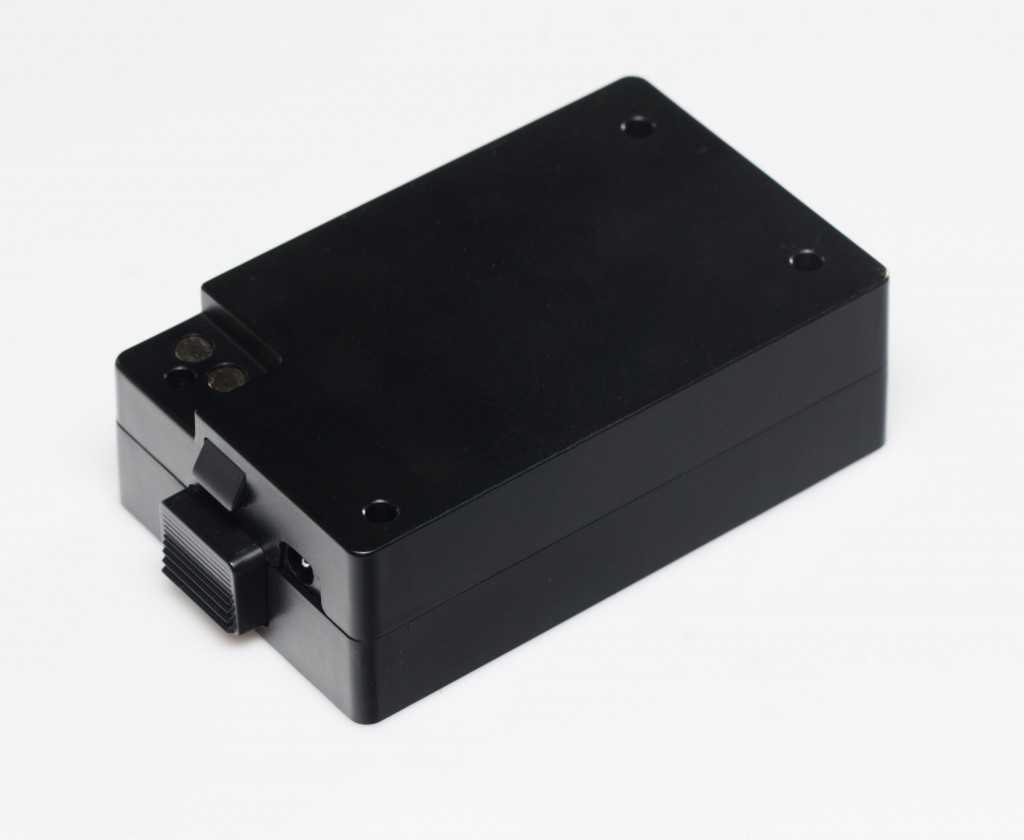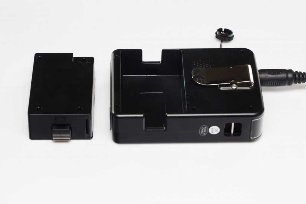 Блок питания Falcon Eyes AC-C1 с отсоединенной батареей. С этой стороны видно и клипсу, которой блок питания может быть закреплен на ремне. Также есть возможность прикрепить блок питания на ремешке или повесить его на плечо вместе с капроновым кофром.