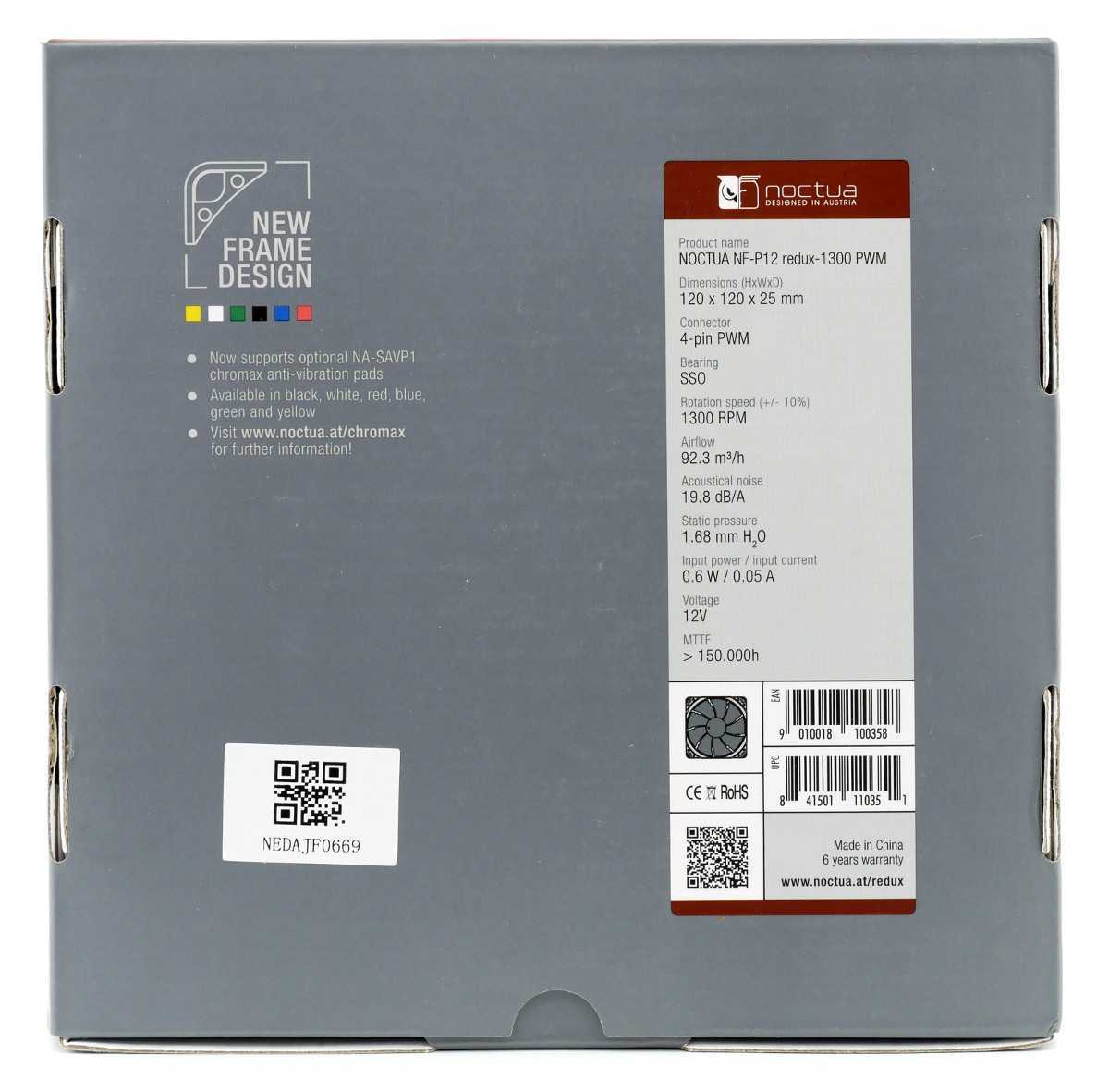 Заменяя старые линейки вентиляторов новыми «урезанными» Redux-сериями, Noctua ударились в крайности: конечно, отсутствие переплаты за красивую упаковку и комплектные переходники, которые не всегда и нужны – это хорошо, но ведь из комплектации убрали даже антивибрационные вставки по углам. Впрочем, уровень вибраций у вентилятора сам по себе очень низкий, так что это не особо страшно. А вот те, кто считал старые коричнево-бежевые вентиляторы Noctua скучными по дизайну, теперь возьмут свои слова обратно: новые еще скучнее! Зато качество здесь именно то, что и ждешь от Noctua – вентилятор, абсолютно бесполезный на радиаторах, именно как корпусной идеален, обеспечивая поток в 59.21 CFM всего на 1200 об/мин.