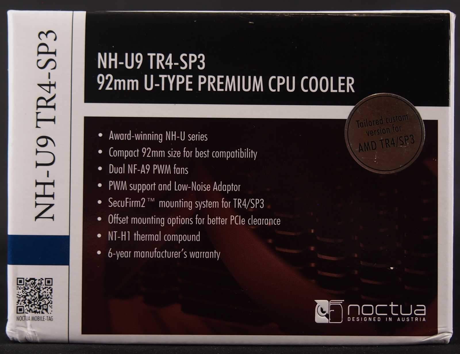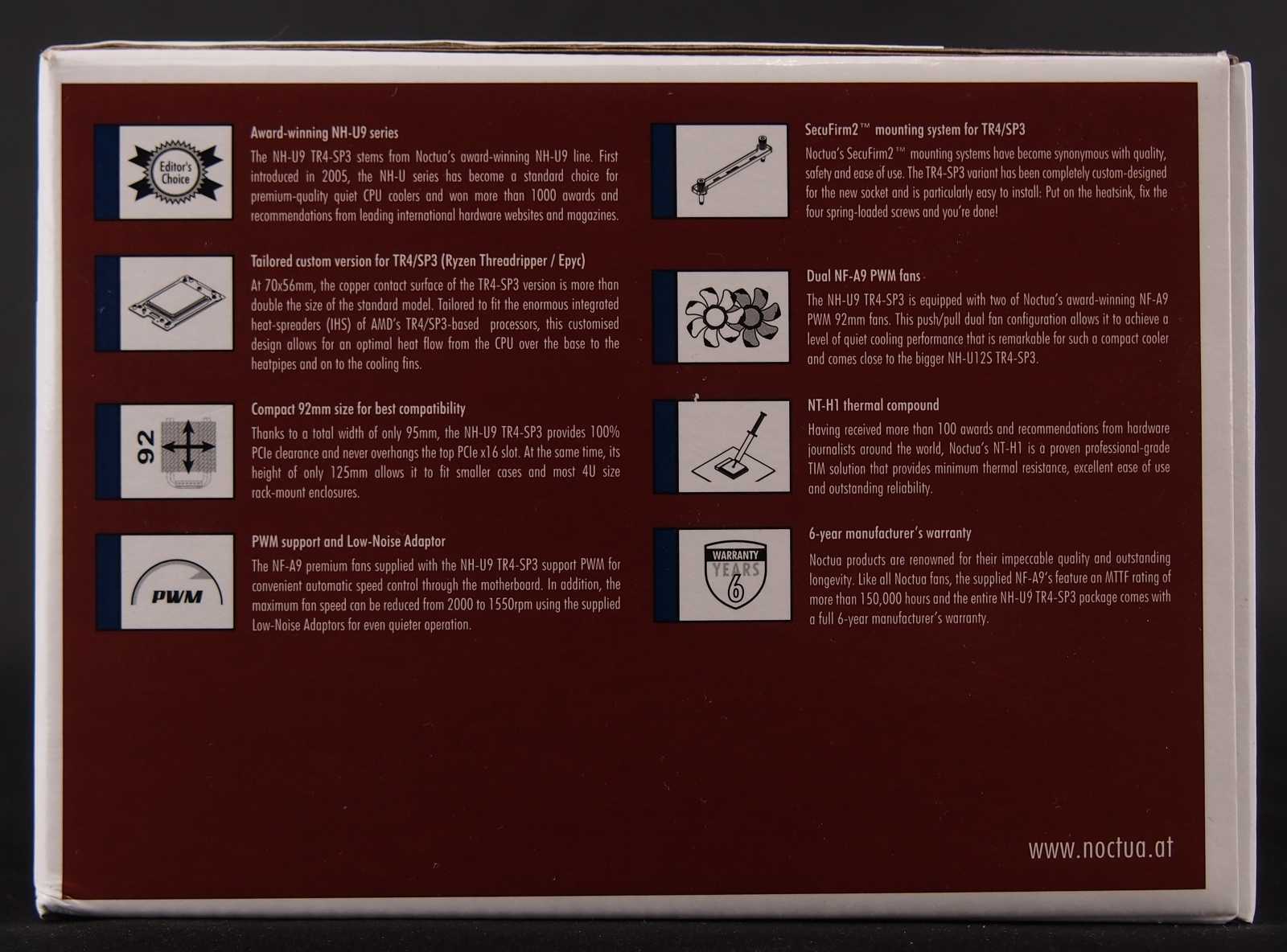 Про основные преимущества NH-U9 TR4-SP3 производитель рассказывает на одной из торцевых граней упаковки. В плюсы кулеру относится компактный дизайн, качественные и тихие вентиляторы NF-A9, удобное крепление SecuFirm2, оптимизированное плавающее крепление для совместимости с графическими адаптерами, фирменная термопаста и 6 лет гарантии.