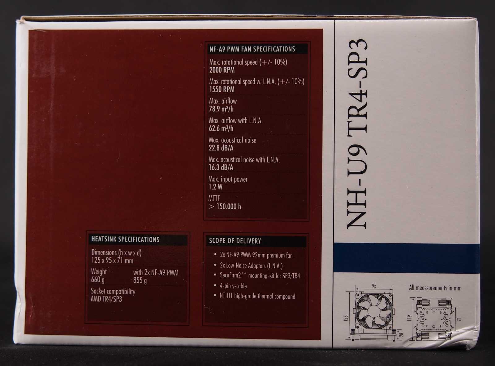 Технические характеристики NH-U9 TR4-SP3 и особенности конструкции описаны на других торцевых гранях коробки. Здесь же представлена габаритная схема кулера NH-U9 TR4-SP3. Исходя из заявленных параметров, высота NH-U9 TR4-SP3 не превышает 125 мм.