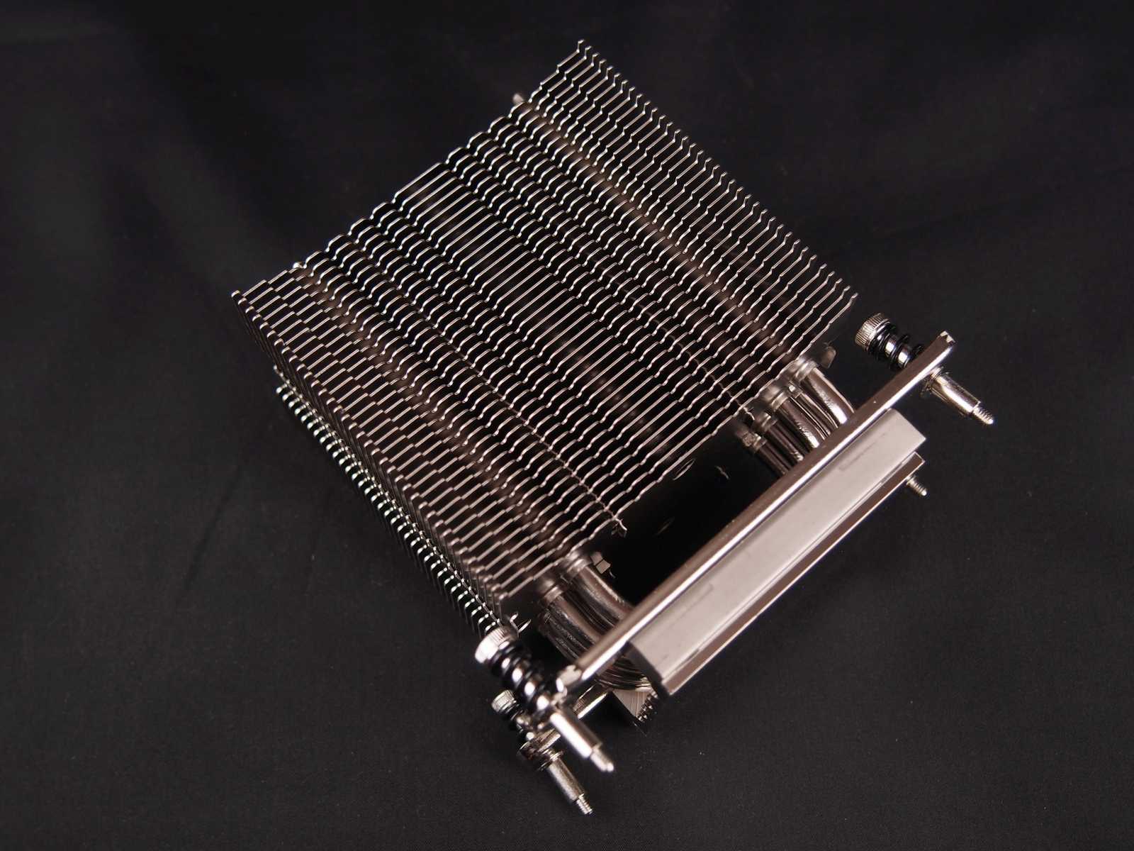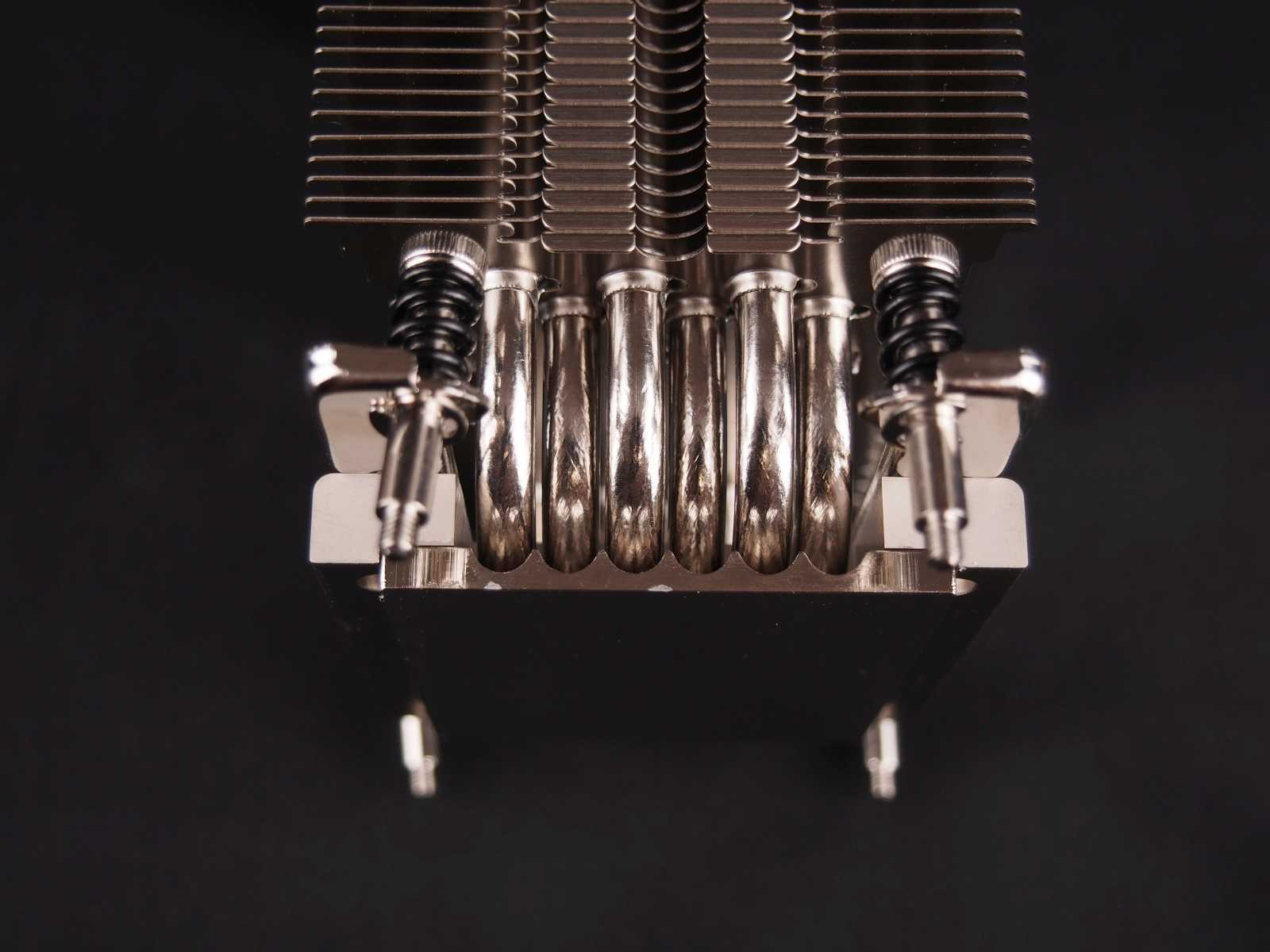 Переносом тепловой энергии от основания к теплорассеивателю занимаются шесть медных тепловых трубок. Их диаметр составляет шесть миллиметров. Удерживают рабочее тело не только они, им на помощь установлена отдельная подпорка. При взгляде сверху становится видным, что массив из алюминиевых рёбер представляет квадрат 14 на 14 сантиметров. Это говорит о том, что изначально система охлаждения разрабатывалась под вентиляторы форм-фактора 140 миллиметров. Трубки расположены не равномерно, а сгруппированы так, чтоб попадать под самые продуваемые области вентиляторов. Сами пластины ровные, без изгибов, только края с углублениями и гребёнками. У основания трубки уложены в специальные желоба и дополнительно пропаяны. Уложены они плотно, расстояние не более полутора миллиметров. При этом толщина основания составляет примерно 2 мм. Качество сборки на высоком уровне, тепловой контакт усилен и у основания и на пластинах. Вот только полировка далеко не зеркальная, да и с ровностью тоже проблемы. По сравнению с Noctua NH-D14 в этом плане он выглядит на порядок хуже.
