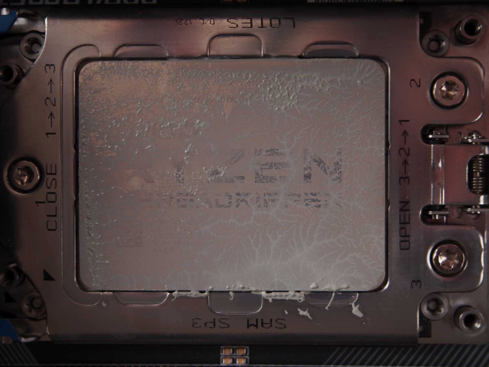 В случае с кулером NH-U9 TR4-SP3 мы демонстрируем отпечаток термопасты на процессоре и контактной площадке системы охлаждения. Отпечаток получился достаточно ровным, хоть и немного смещенным в правый верхний угол ввиду точки отрыва кулера при его демонтаже.