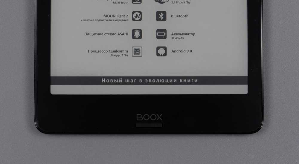 Переходим к святая святых… Дисплей, «очерченный» широкими рамками, прикрыт матовым стеклом по всей поверхности (пальцы скользят легко). Внизу одна физическая кнопка и над ней надпись «BOOX».
