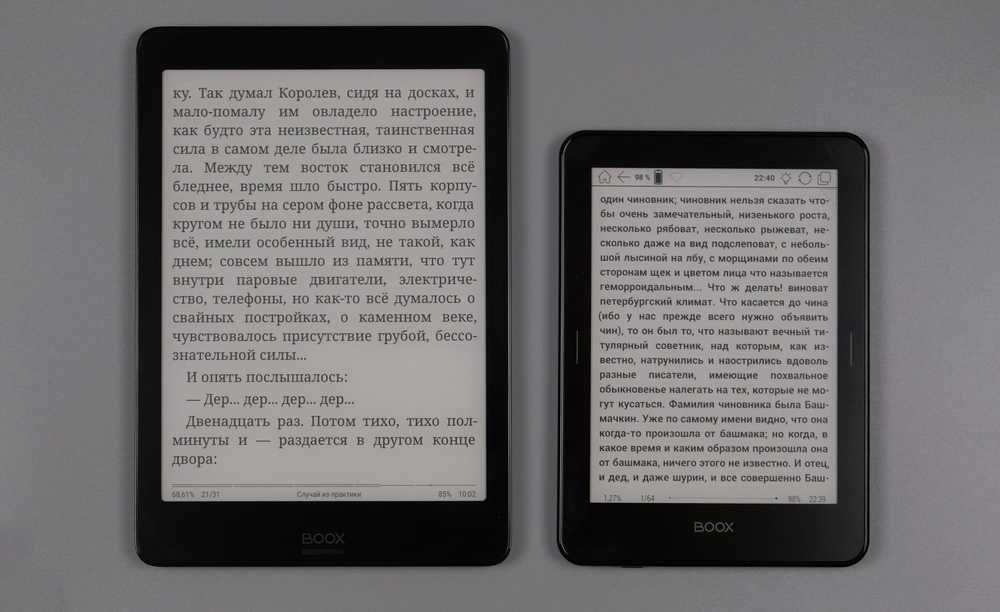 Размер подобной книги волнует многих, поэтому остановимся на нём подробнее. Размеры корпуса — 197,3 х 137 х 7,7 мм, вес без чехла — 265 грамм, в чехле — 360 грамм. Для сравнения приведём фото ONYX BOOX Kon-Tiki рядом с классической 6-дюймовой книгой ONYX BOOX Monte Cristo 5. На первый взгляд разница в размерах большая, но после нескольких дней использования её перестаёшь замечать.