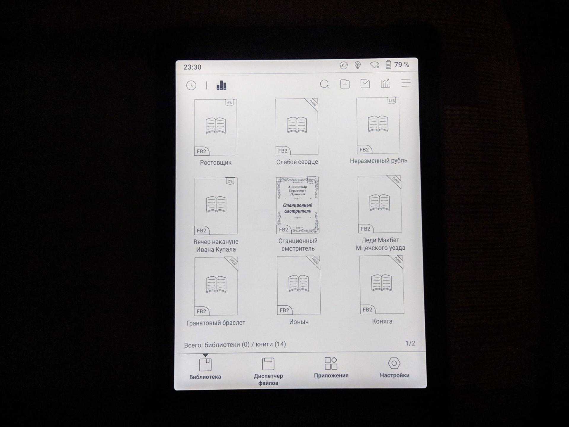 Ну а что касается непосредственно работы с книгами, то тут всё в духе Onyx. Есть библиотека, которая сортирует работы по авторам, названиям и сериям. В поиске их можно находить с помощью фильтров. А установка книг — моментальная. Стандартные читалки позволяют открывать их даже с zip-файлов, но я всё же решил пользоваться сторонними.