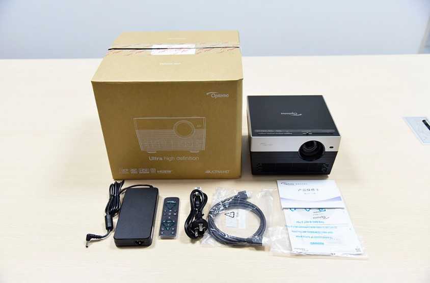 Optoma I5+ доставляется в плотной, хорошо упакованной коробке, защищающий проектор от факторов внешней среды во время доставки. В комплект поставки входит: сам проектор, HDMI кабель, блок и кабель питания, пластиковый пульт ДУ и инструкция.