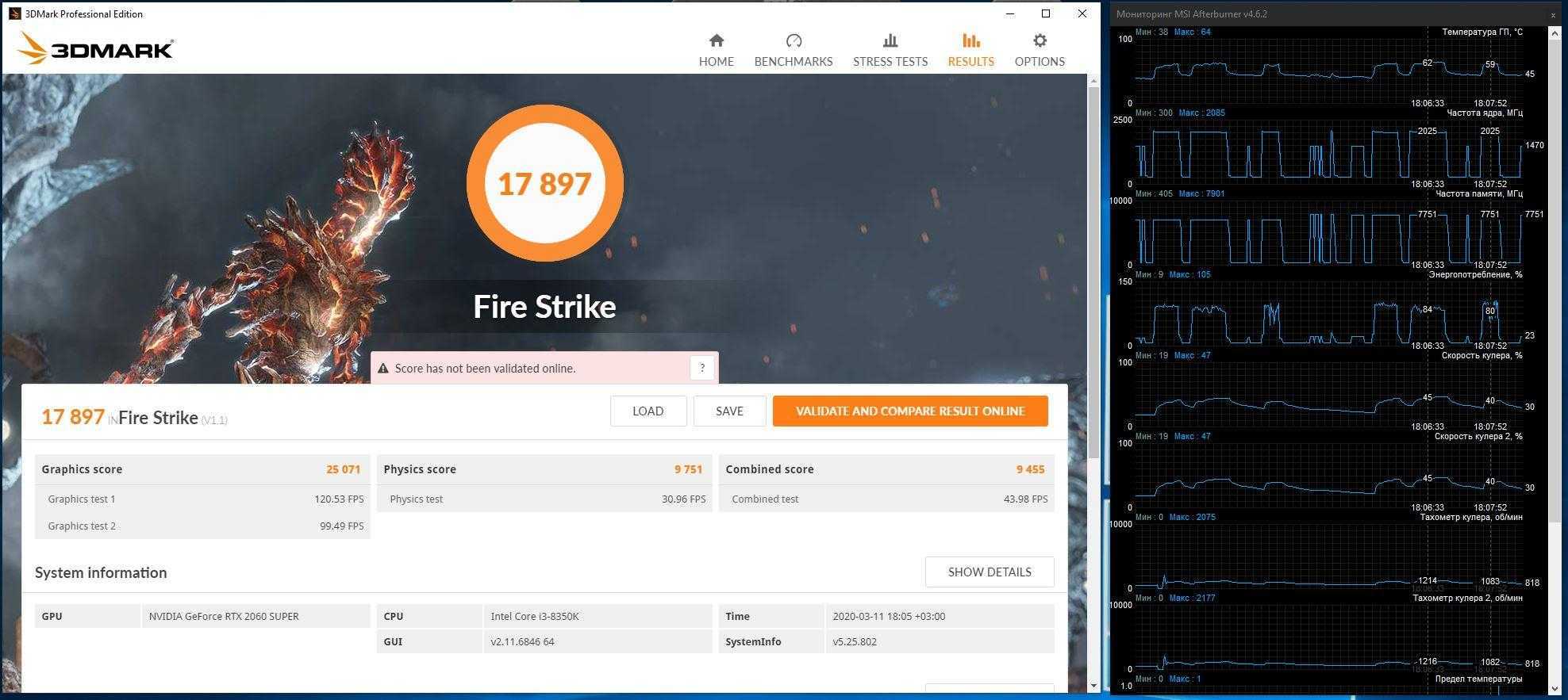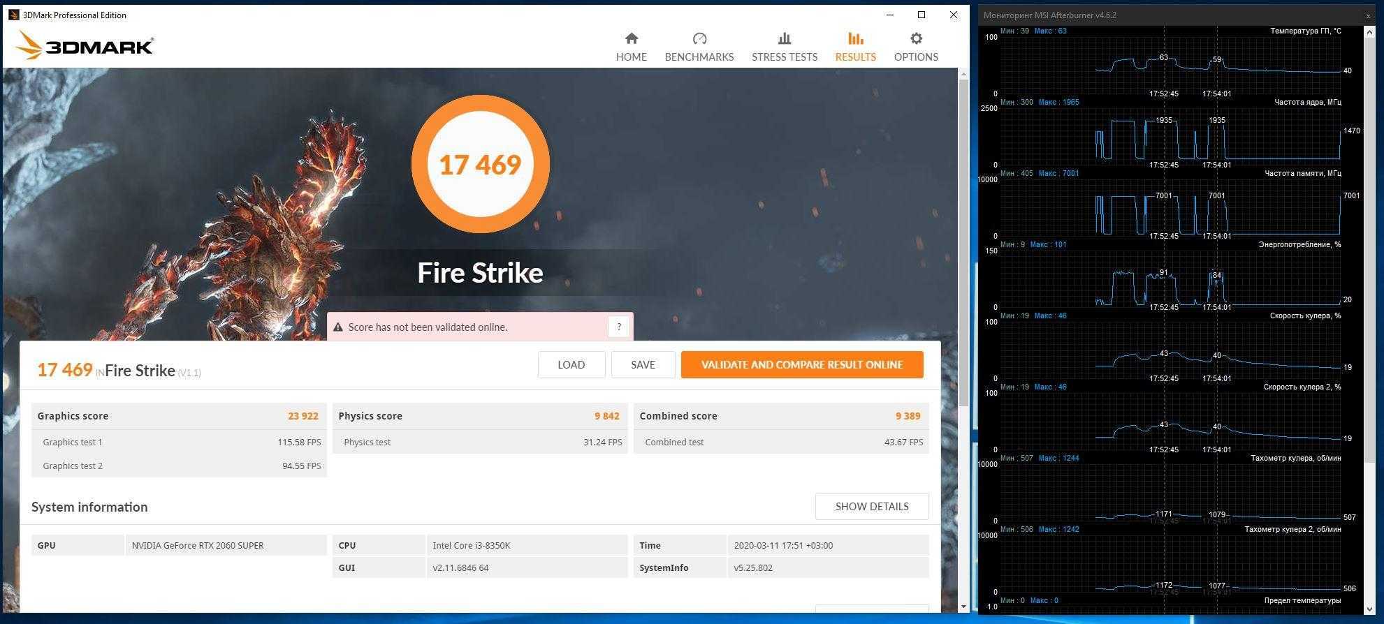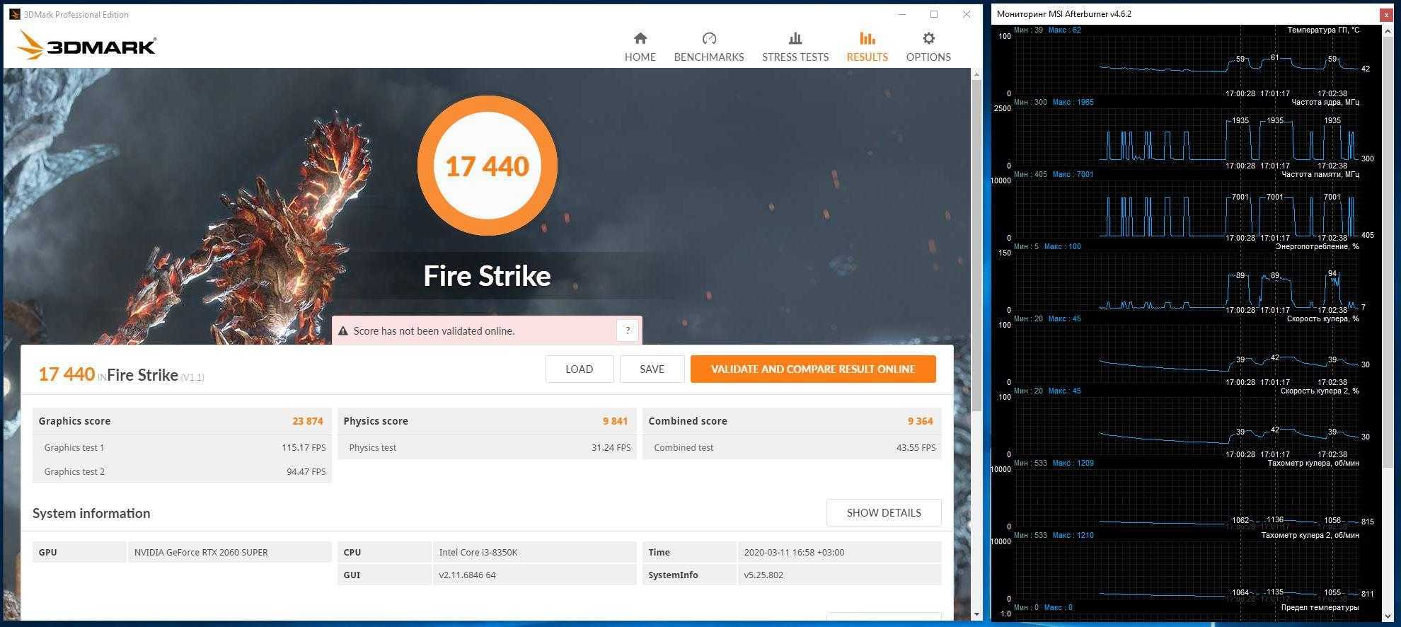 В стоковом режиме Palit GeForce RTX 2060 Super JetStream набрала в бенчмарке 3DMark Fire Strike 23 874 балла. GPU зачастую работал при 1935 МГц, иногда при 1965 МГц, а температура колебалась около 60 градусов (при 1200 об/мин – очень тихо).