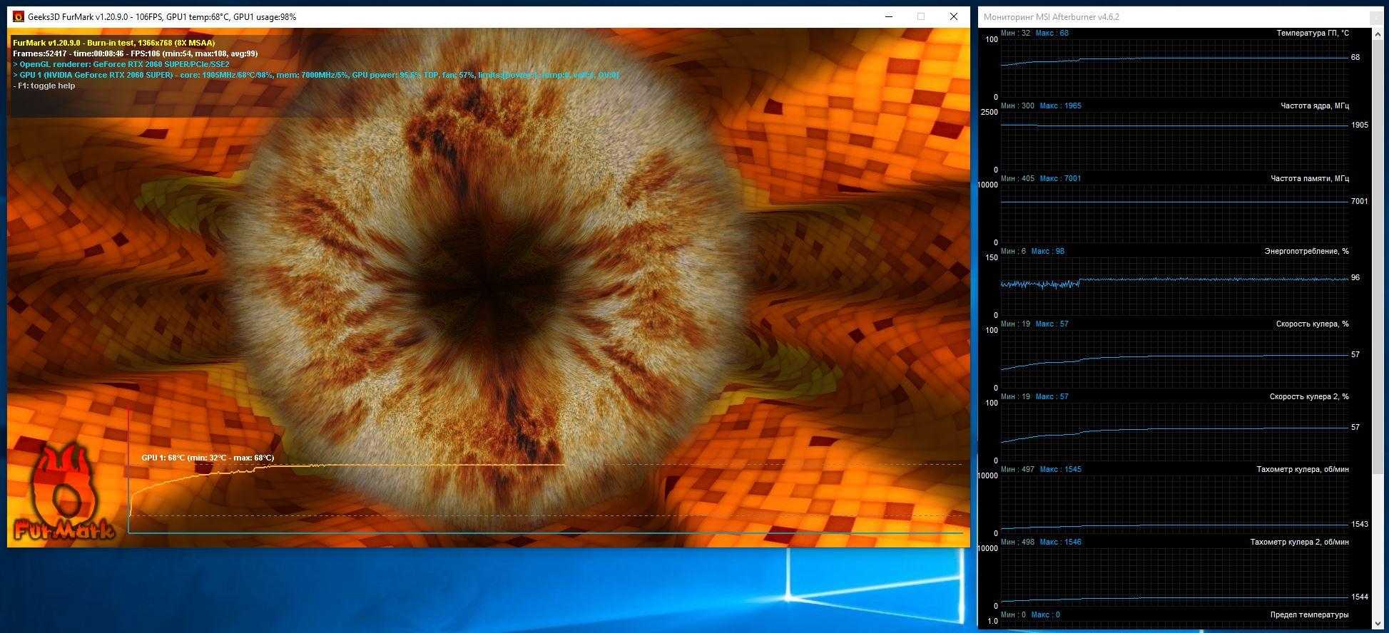 Как обычно стартуем с системы охлаждения. В Furmark графический процессор прогрелся всего до 68 градусов, при том вентиляторы вращались на 57% (это порядка 1550 об/мин, и да, здесь есть тахометры). Видеокарта работала очень тихо. Даже в таком тяжелом тесте частота удерживалась не менее 1905 МГц. Максимум – 1965 МГц. Это отличные результаты для RTX 2060 Super.