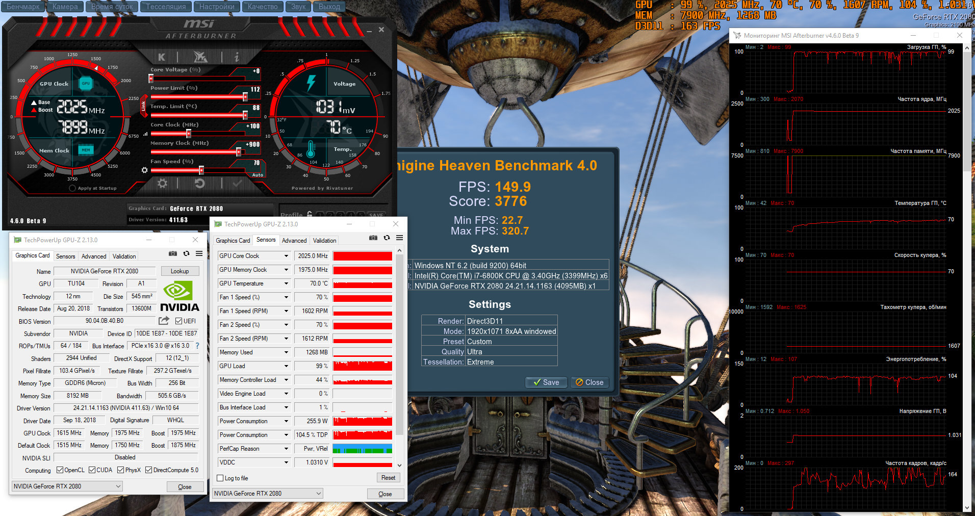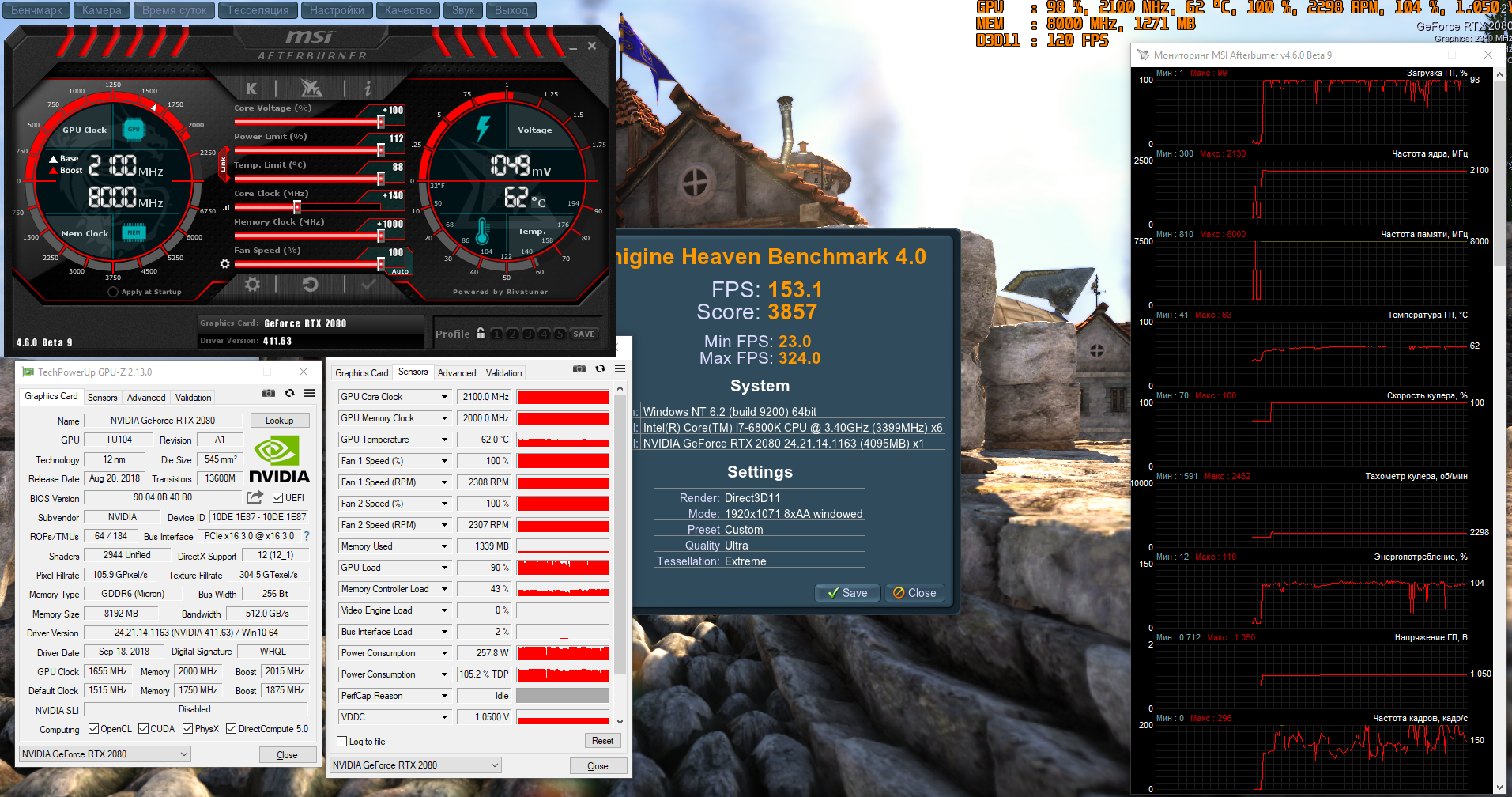 Немножко дополнительных мегагерц дал разгон в ручном режиме. Выкрутив лимиты мощности на максимум, удалось получить +120 МГц. В 3DMark максимальная частота достигала 2085 МГц, но обычно держалась около 2025 МГц.