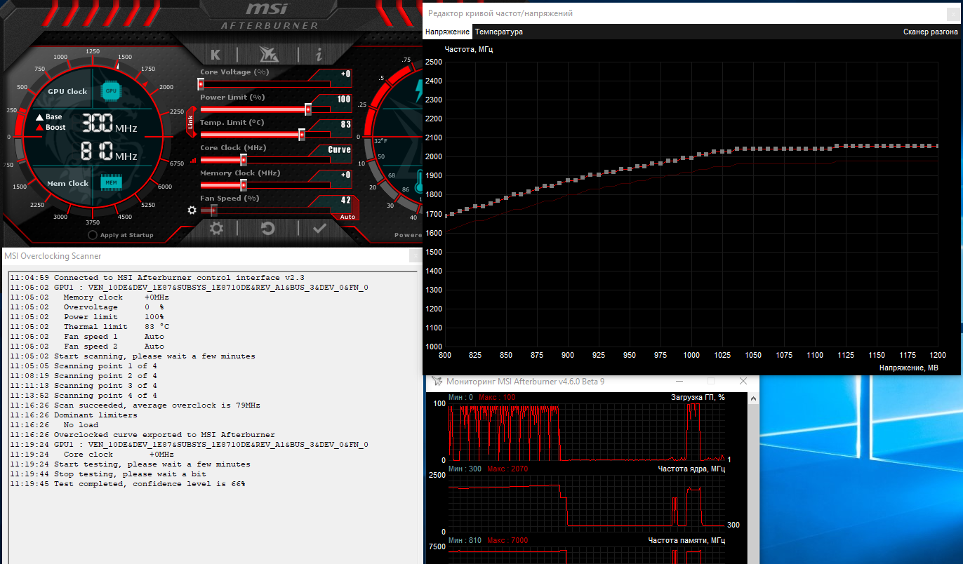 Возможности разгона сперва были проверены утилитой OC Scanner из MSI Afterburner, которая может автоматически подобрать частоту GPU, но не памяти. После нескольких прогонов OC Scanner соврал, наобещав ещё 20 МГц прироста.