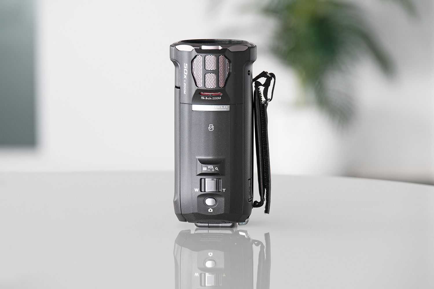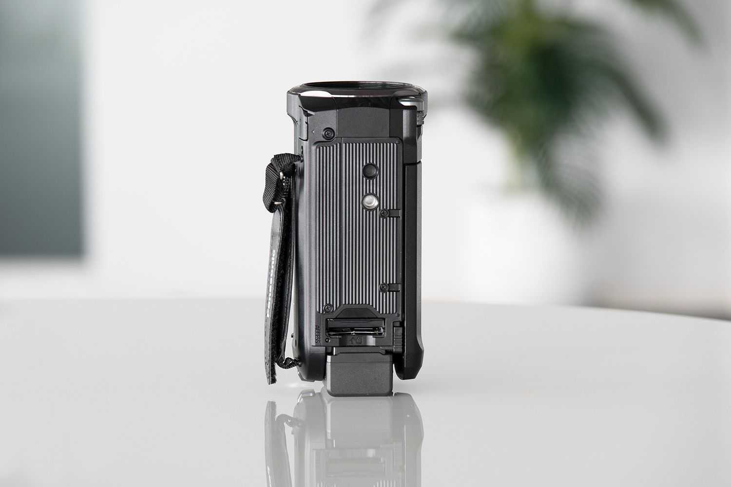 Гнездо для наушников находится справа от объектива за шарниром, а по направлению к задней части устройства — раздвижной дверцей, через которую открывается порт питания. Внизу вы найдете слот для SD-карты за поворотной дверцей. Задняя часть видеокамеры содержит адаптер для крепления обуви, что позволяет использовать множество аксессуаров.