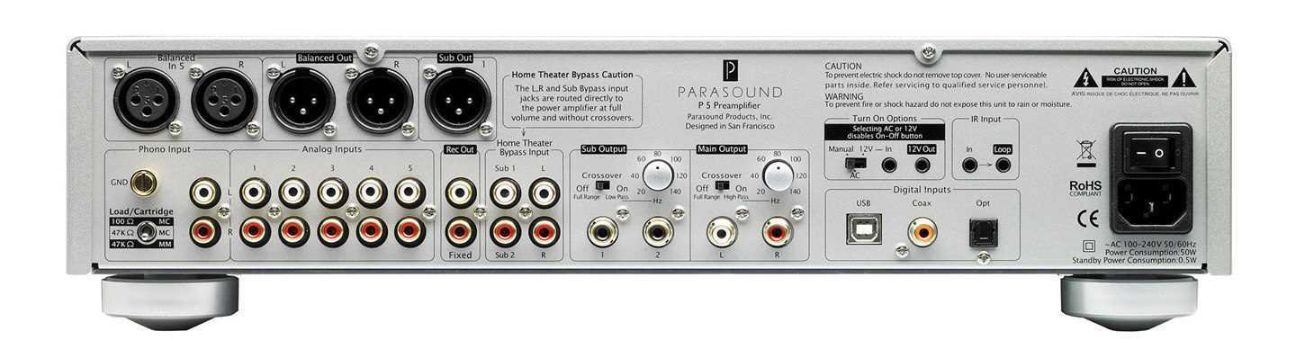 Parasound P5 имеет две платы кроссовера, позволяя идеально согласовать сабвуфер и фронтальную пару