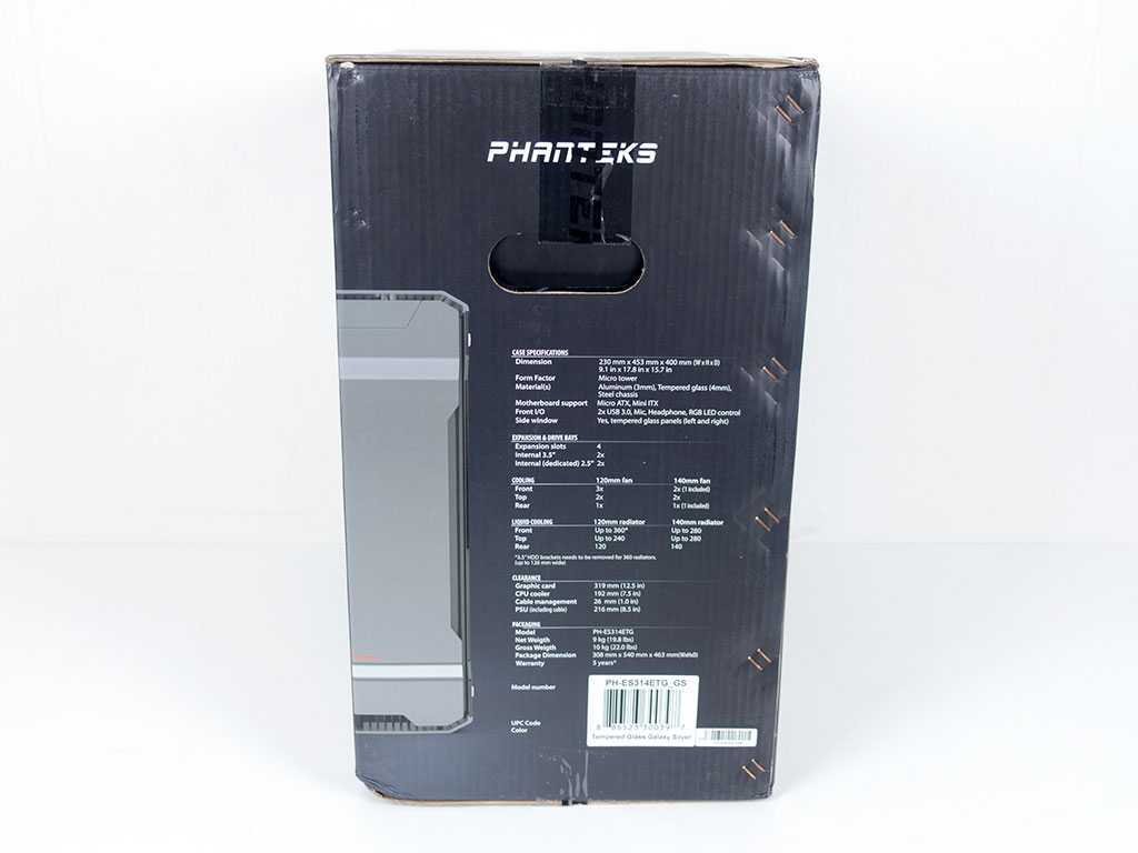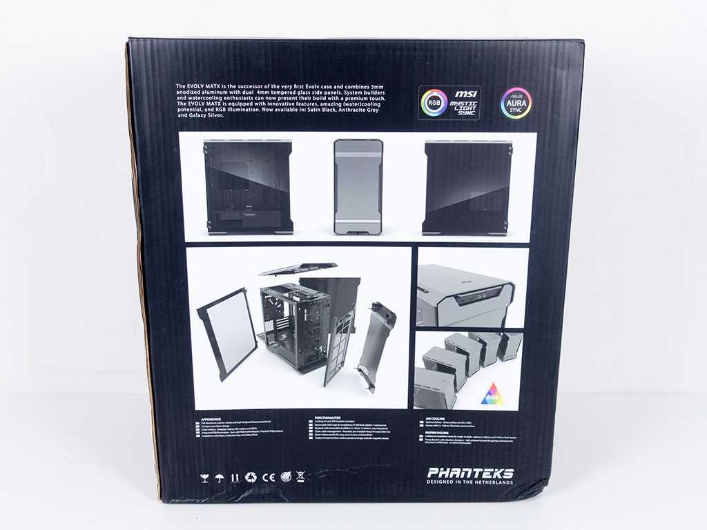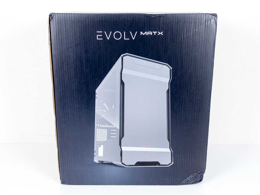 Phanteks поставляет корпус Enthoo Evolv в полноцветной картонной коробке с большим изображением корпуса на лицевой стороне и более мелкими, но раскрывающими детали, изображениями на задней стороне. Спецификации корпуса мы можем найти на одной из боковых сторон, а на противоположной — только логотип Phanteks. Коробка имеет отверстия для удобного перемещения упаковки.