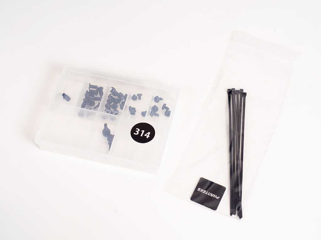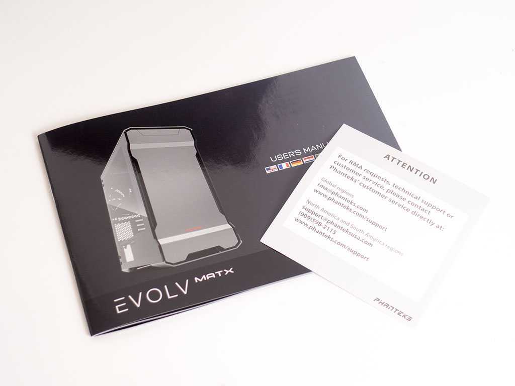 Внутри мы видим коробку с отсортированными винтами, несколько застежек-молний и наклейку Phanteks. Кроме того, в комплекте поставки есть квадратная монтажная пластина для размещения жидкостных охлаждающих элементов в корпусе. Хорошо написанное руководство завершает содержимое.