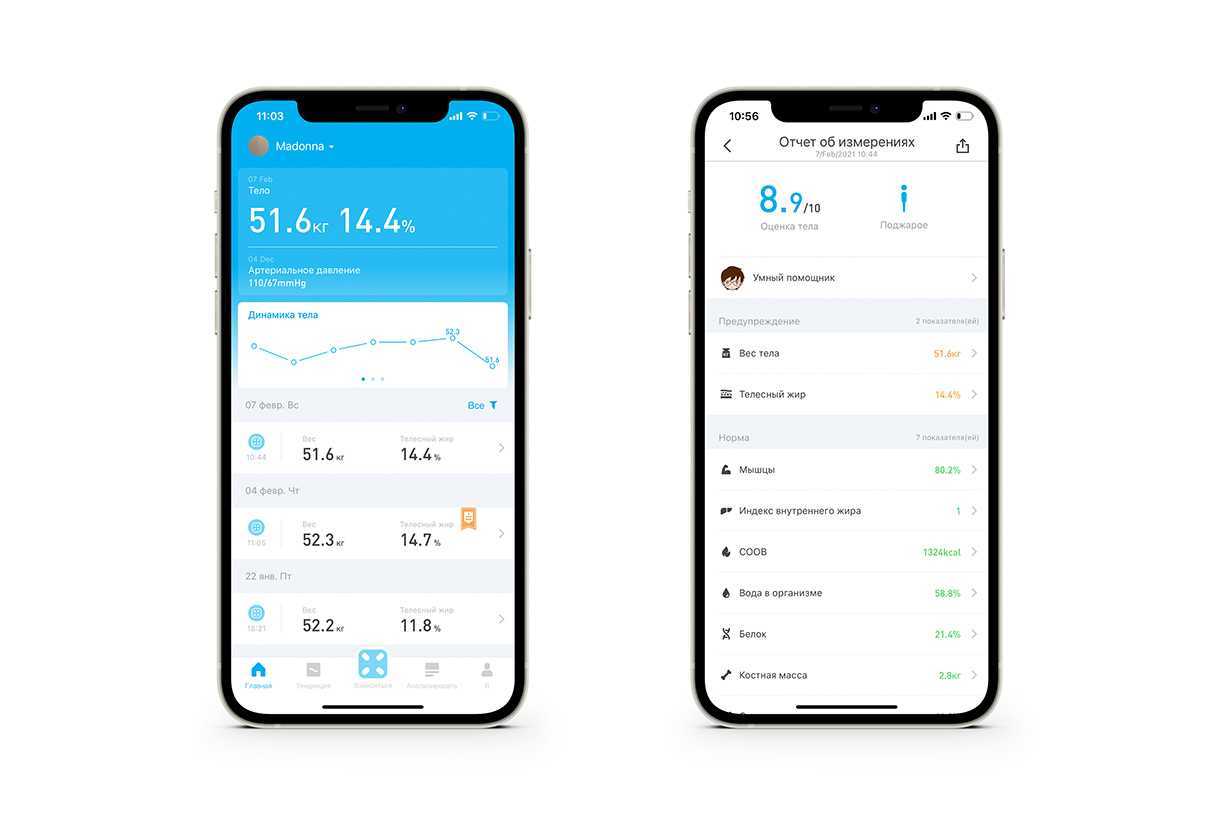 На основном экране приложения отображается балльная оценка физического состояния по 10- балльной шкале, вес пользователя, процент телесного жира и тенденция изменения веса за предыдущую неделю, а также история последних измерений. Нажав на свой вес, можно просмотреть «Отчет об измерениях». Это один из главных инструментов для анализа показателей, в котором можно посмотреть данные по всем показателям:
