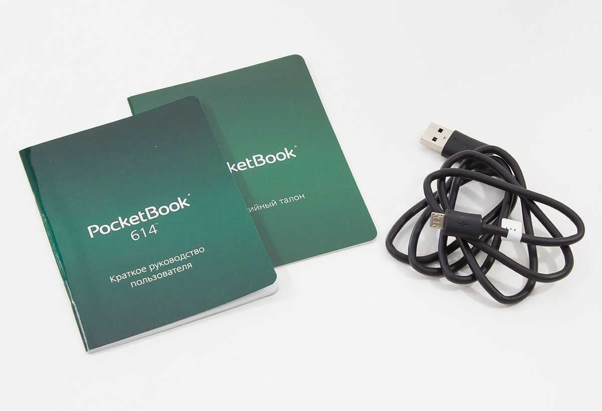 Комплектация PocketBook 614 Plus включает ридер, инструкцию пользователя, гарантийный талон и USB-кабель для подключения к компьютеру или зарядному устройству. Не много? Ну так и стоимость ридера не заоблачная.