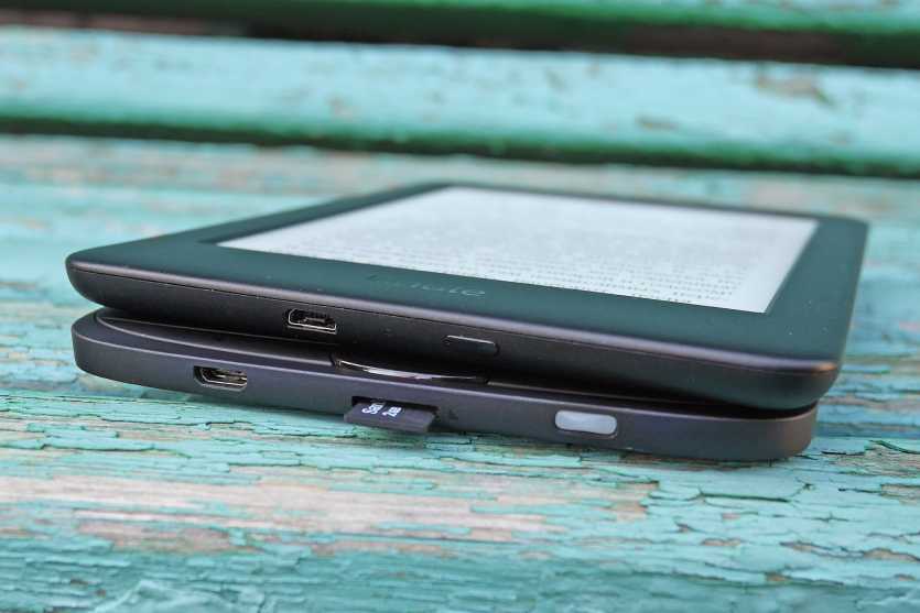 Вот фотка нижних граней ридеров. У Kindle 9 там только MicroUSB и кнопка включения, а вот у PocketBook 616 помимо этих элементов есть еще и слот для MicroSD емкостью до 32 Гб.