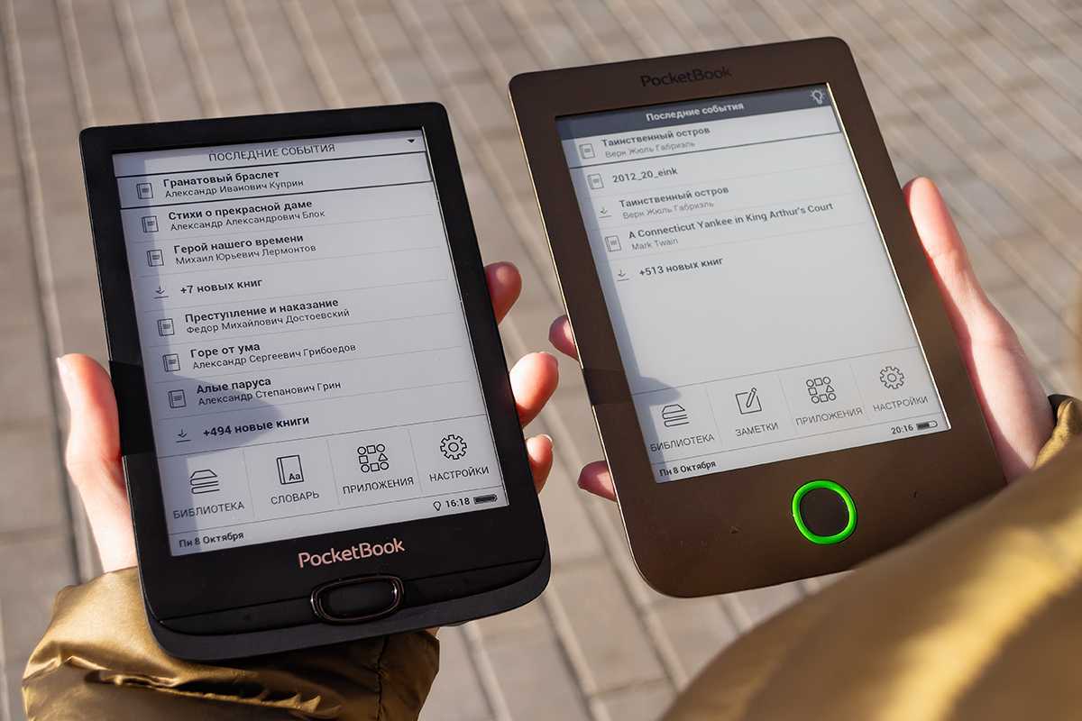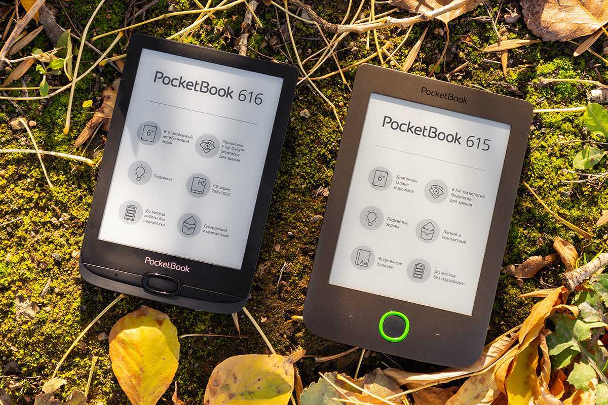 На фото ниже — PocketBook 616 (слева) и предыдущая модель — PocketBook 615 Plus . Последняя выглядит значительно крупнее 616-й. При этом экраны у этих двух ридеров совершенно идентичны — 6 дюймов. Зато в ширину новый покетбук короче на 7 миллиметров, а в длину — аж на 15. То есть представитель обновленной линейки на целых 20% компактнее своего предшественника! Аналогично и другие модели новой линейки покетбуков на 20% компактнее своих предшественников предыдущего поколения.