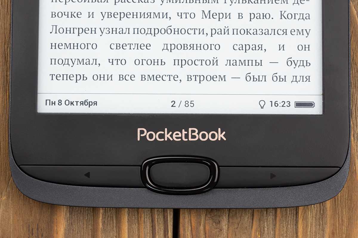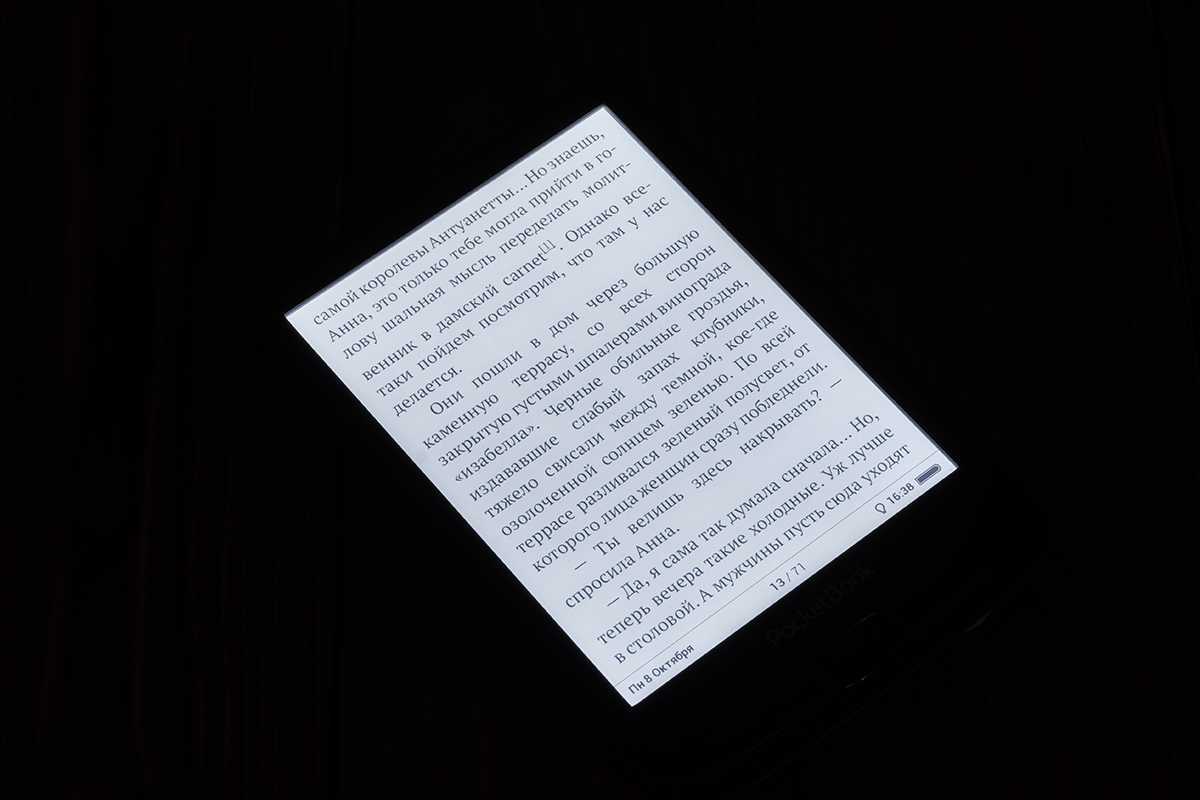 По качеству картинки дисплей PocketBook 632 сравним с хорошей бумажной книгой. Буквы четкие и черные, фон практически белый. Благодаря высокому разрешению на шрифтах видны практически все «завитушки» и прочие очень мелкие элементы.
