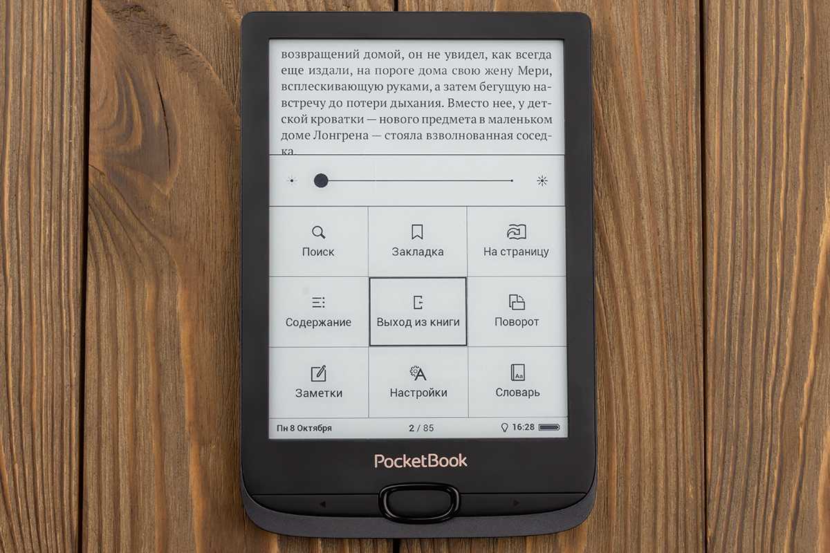 Радует, что подсветка, которая несколько лет назад была прерогативой премиального сегмента, со временем добралась и до бюджетных ридеров. Как уже говорилось выше, PocketBook 616 — самый доступный из всех покетбуков, обладающих этой опцией. Подсветка тут однотонная: дисплей освещается равномерным белым светом. В настройках есть шкала регулировки — при желании можно выбрать приятный глазу уровень яркости.