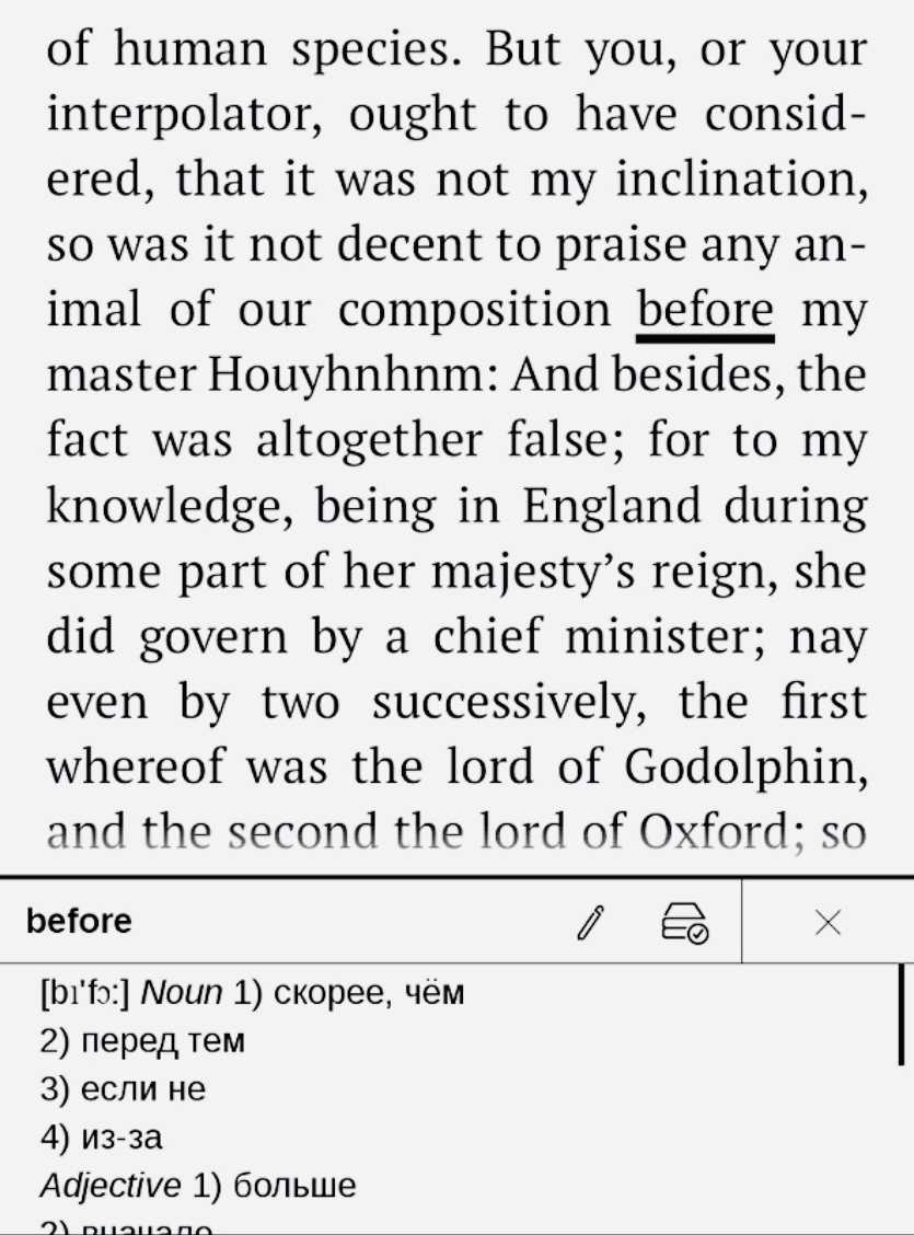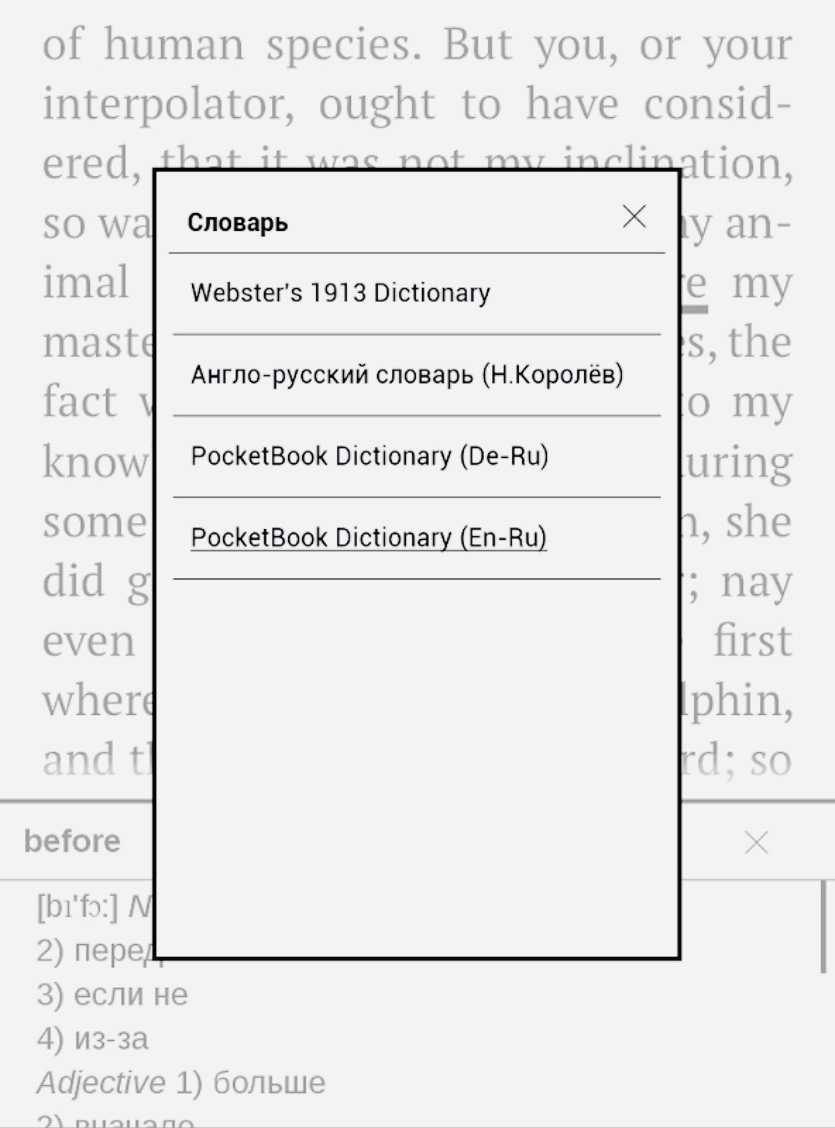 В ридере предустановлено четыре словаря, которые можно вызывать как из меню, так и прямо в момент чтения книги — выделяем слово и тут же, прямо поверх текста получаем его перевод.