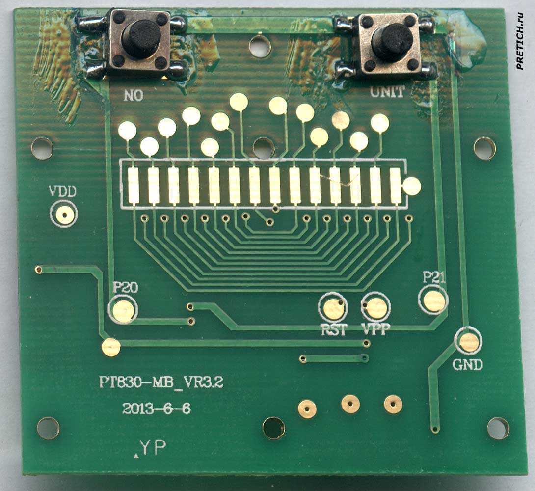 Плата электроники, на ней маркировка: PT830-MB_VR3.2 2013-6-6 YP. С этой стороны платы две кнопки управления и контактные площадки на ЖК-дисплей.