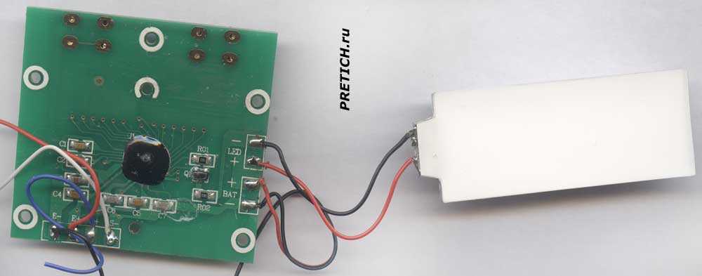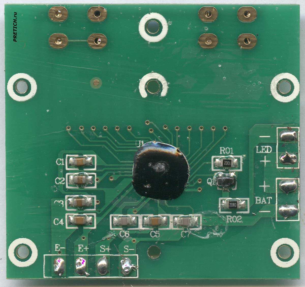 Обратная сторона платы. По центру микросхема — бескорпусная, залитая компаундом, естественно без маркировки… Также небольшое количество SMD элементов — резисторов и конденсаторов. Все провода припаяны на соответствующие и подписанные площадки: питание, подсветка дисплея, провода от датчика…