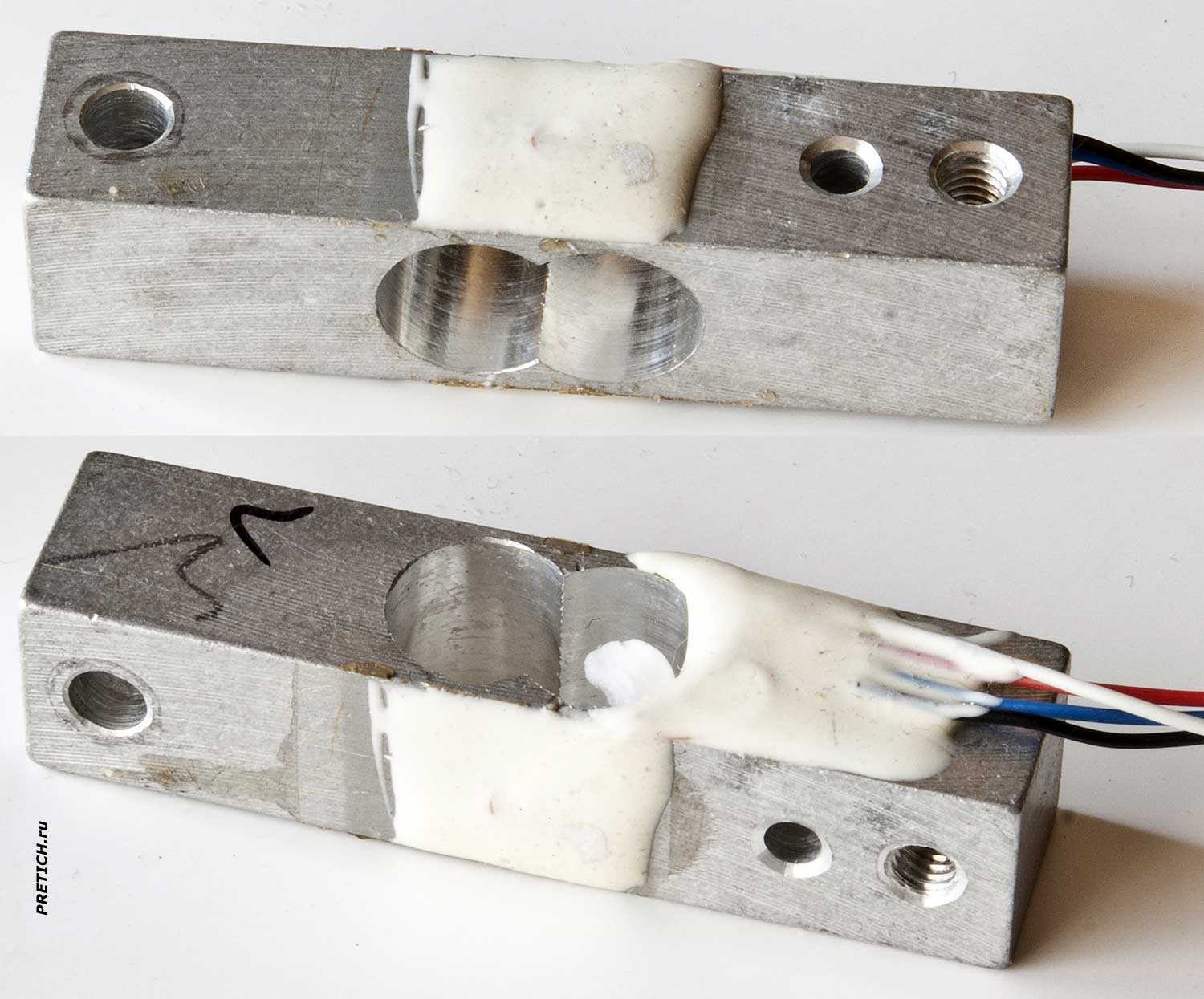 Ну и наконец, основная часть — датчик. Разумеется, это абсолютно другое устройство, нежели механические весы. Электронные весы имеют так называемый тензодатчик, где пластины тензорезисторов реагируют на малейшую деформацию… В данном аппарате использован сенсор на алюминиевом бруске с двойным отверстием. Это самый массовый и распространенный тензодатчик в бытовых весах такого типа…