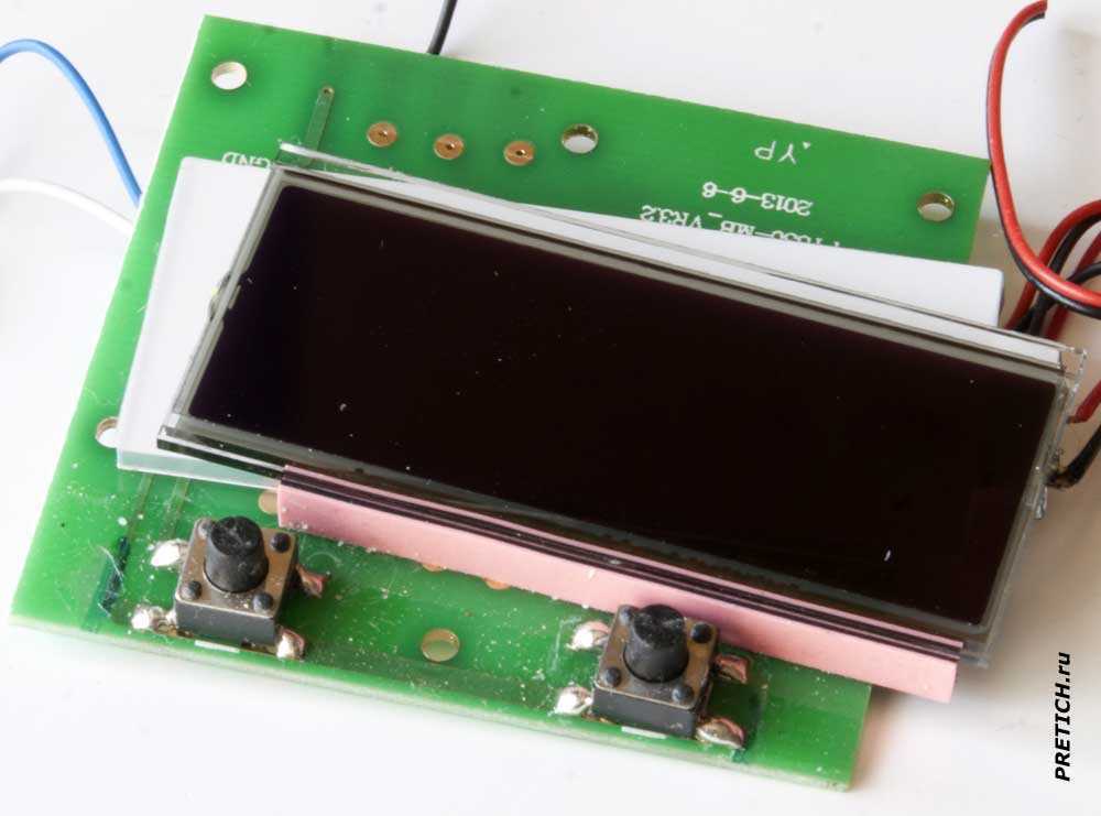 Дисплей монохромный, размеры 45 х 15 мм, диагональ 52 мм. Крупные и хорошо читаемые цифры. С платой электроники дисплей контачит через полоску анизотропной резины…