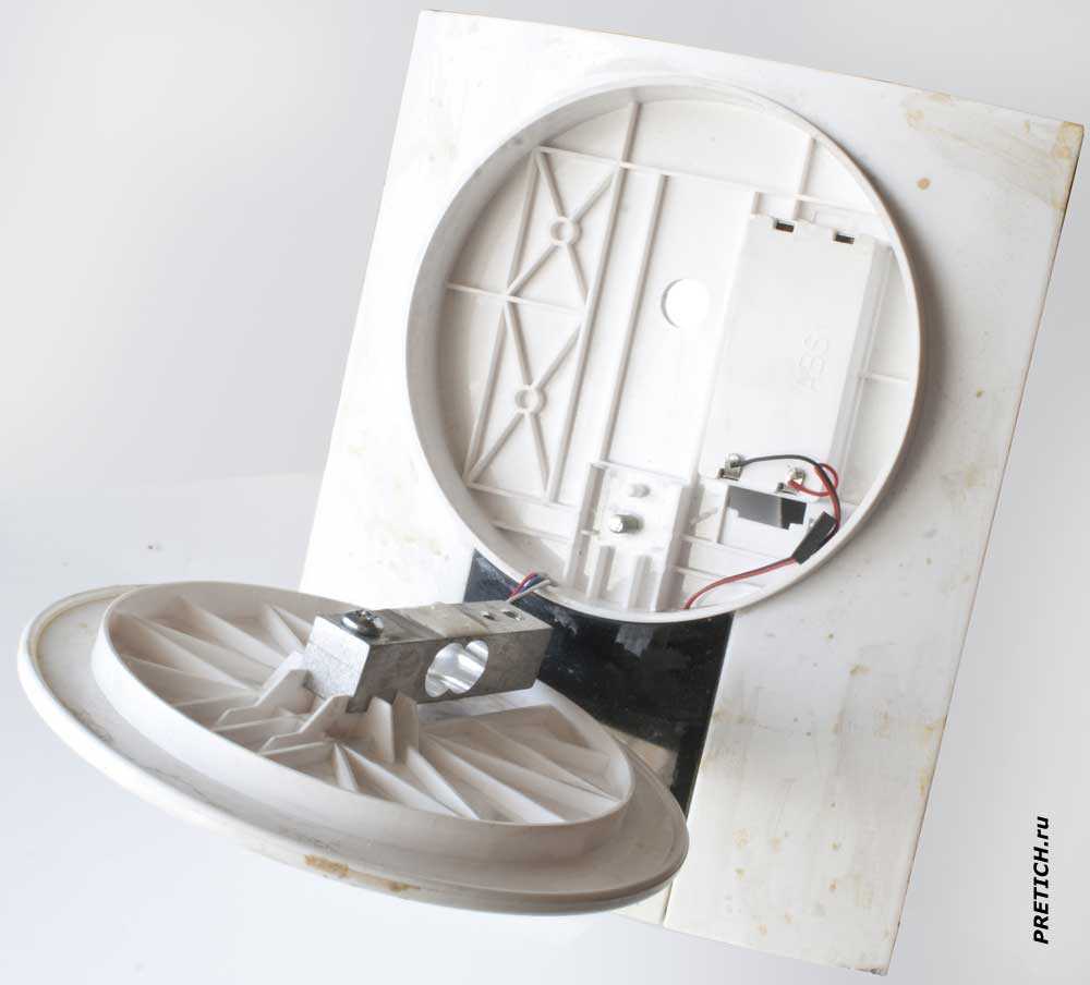 Вот как подробно все внутри устроено… Датчик, он прикреплен к чашке весов — она, по сути, на нем лежит. Другой стороной датчик прикреплен к основанию весов… От датчика вовнутрь уходят провода.