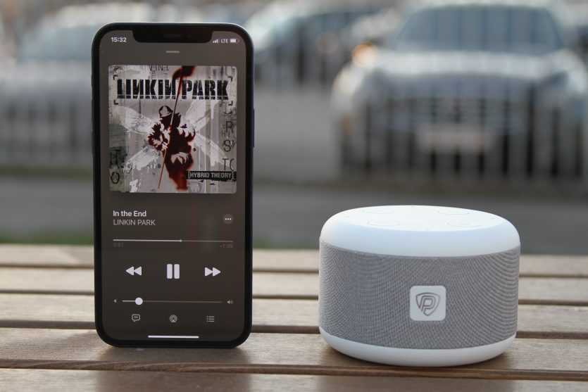 Обтянут девайс акустической тканью, а на верхней его грани есть четыре аппаратных кнопки – уменьшения и увеличения громкости, запуска/приостановки воспроизведения и отключения микрофона.