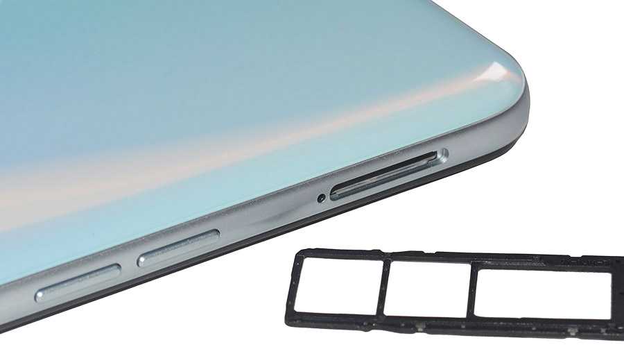 Расположение элементов по классике: внизу microUSB, два микрофона и mini-jack. Справа кнопка питания и качелька громкости. Наверху пусто, слева тройной слот — под две nanoSIM и одну карту памяти до 256 ГБ. Динамик расположился на задней крышке под логотипом.