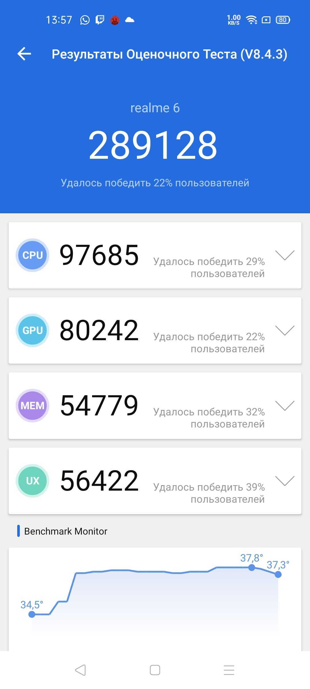 Сердцем realme 6 стал Helio G90T (8 ядер до 2,05 ГГц). В роли графического процессора выступает Mali G76. Также смартфон имеет 128 Гб постоянной и 4/8 Гб оперативной памяти. К нам на тест попал экземпляр в топовой комплектации – 8/128.