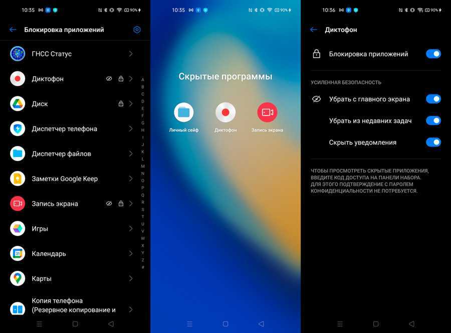 Заблокированные приложения можно скрывать с главного экрана и из списка недавних задач. Причем посмотреть все скрытые программы допускается без пароля конфиденциальности, а только после ввода (предварительно заданного) специального кода доступа на номеронабирателе «Телефона».