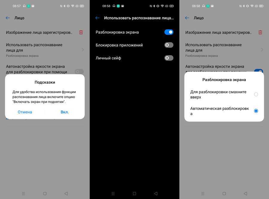 При сохранении данных лица рекомендуется активировать опции «Включать экран при поднятии» и «Автоматическая разблокировка». Данный метод биометрической аутентификации также позволяет ограничивать доступ к приложениям и личному сейфу, когда, помимо пароля экрана блокировки, активируется еще и пароль конфиденциальности.