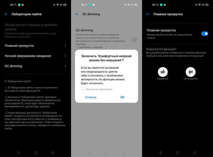 Как уже отмечалось выше, в разделе «Лаборатория Realme» на этапе бета-тестирования доступны, например, такие функции, как DC dimming (ослабляет влияние ШИМ на небольшой яркости) и «Плавная прокрутка» (где, очевидно, не обходится без увеличения частоты обновления экрана).