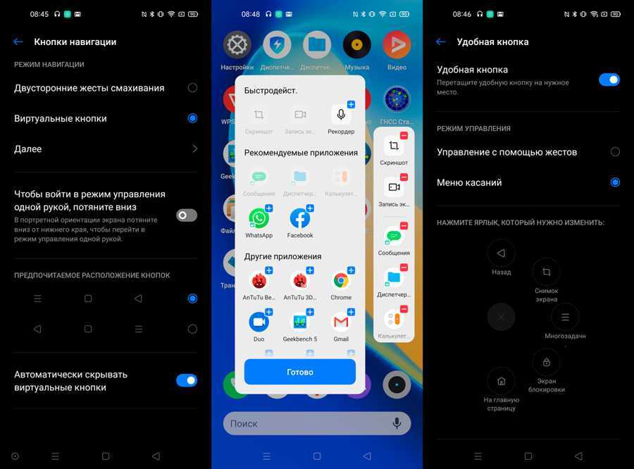 В разделе «Удобные инструменты» на вкладке «Кнопки навигации» предлагается, в частности, определиться со способом управления – с помощью двусторонних жестов смахивания или виртуальных кнопок, которые можно автоматически скрывать. Боковая смарт-панель в том же разделе, для которой задается прозрачность и положение, предназначена для быстрого доступа к инструментам и выбранным приложениям. Из нее, например, легко вытащить программу, чтобы открыть ее на разделенном экране. А вот на вкладке «Удобная кнопка» предлагается управление смартфоном жестами (тапами) или же касаниями через специальное меню.