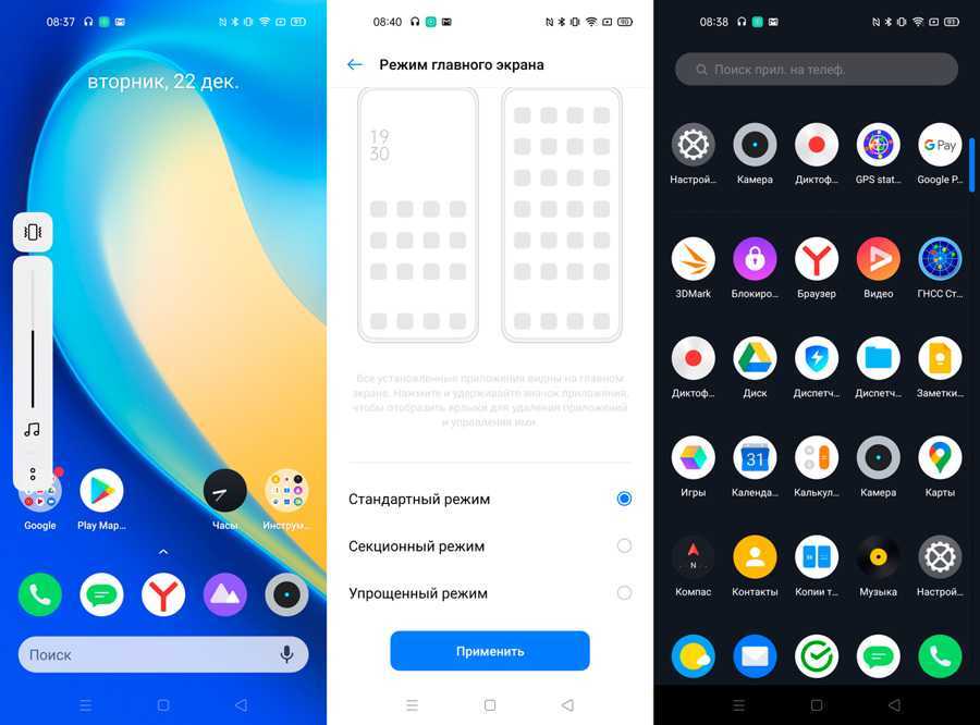 Смартфон Realme 7 Pro работает под управлением операционной системы Android 10, интерфейс которой заменяет фирменная оболочка realme UI 1.0. На вкладке «Режим главного экрана» (раздел «Начальный экран и обои»), помимо упрощенного, предусмотрен выбор стандартного (все ярлыки программ собраны на рабочих столах) или секционного (с отдельным меню приложений) режима.