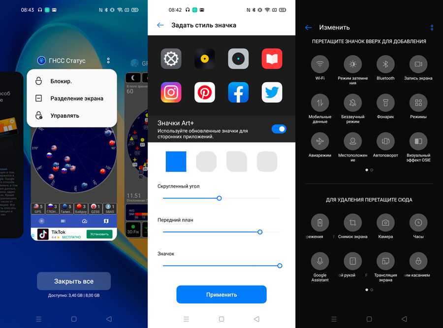 Карточки в списке запущенных приложений располагаются в одном ряду с возможностью горизонтальной прокрутки. После тапа по пиктограмме «две вертикальных точки» появляется доступ к блокировке программы от удаления из списка фоновых, разделения экрана (если возможно), а также переходу к «Диспетчеру недавних задач». Для одновременного закрытия всех приложений служит пиктограмма «Закрыть все» в нижней части экрана. Чтобы отобразить общий и доступный объемы оперативной памяти, следует активировать соответствующую опцию в настройках диспетчера недавних задач. В разделе «Начальный экран и обои» есть возможность самостоятельно задать стиль для значков приложений. Доступ к панели быстрых переключателей, как обычно, осуществляется с помощью свайпа от верхнего края экрана.