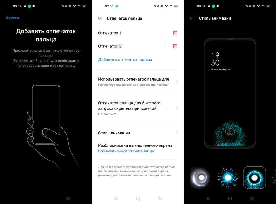 Настройки для этого метода доступны такие: на какой-либо отпечаток можно назначить запуск скрытого приложения, есть 8 стилей анимации разблокировки, а также можно оставить отображение значка отпечатка пальца на выключенном экране.