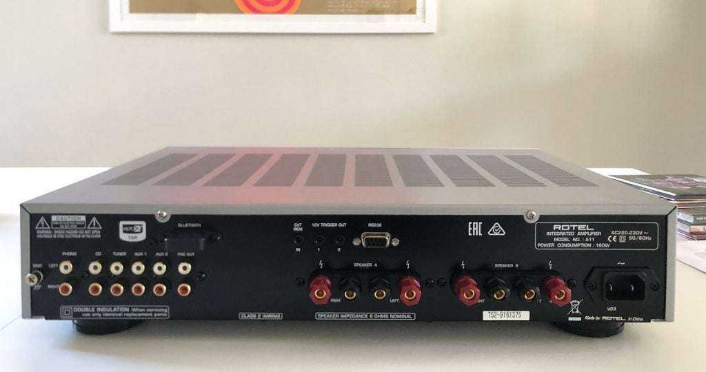 Его негабаритный тороидальный трансформатор помогает ему вырабатывать 50 Вт мощности, а его мощности достаточно для питания двух комплектов динамиков одновременно, если вы того пожелаете. Под капотом также находится цифро-аналоговый преобразователь высокого разрешения Texas Instruments 24 бит / 192 кГц, который работает только с потоками Bluetooth. На задней панели есть небольшой Bluetooth-приемник, а также набор из четырех линейных входов, фонокорректор с подвижным магнитом для вертушек, предварительные выходы для использования с усилителем мощности и клеммы для двух комплектов громкоговорителей.