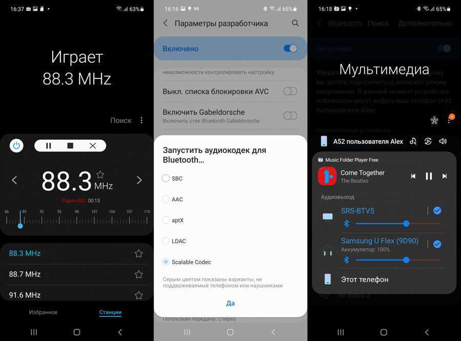 Проводная гарнитура понадобится в качестве коротковолновой антенны для работы FM-тюнера, который умеет записывать онлайн-трансляции в M4A-файлы. Предусмотрена еще опция вывода звука от выбранного приложения на соответствующее аудиоустройство (отличное от главного). Беспроводным «ушам» для передачи качественного звука помогут Bluetooth-кодеки, в том числе, AAC, aptX и проприетарный Samsung Scalable (похож на aptX Adaptive). Кроме того, по интерфейсу Bluetooth к Galaxy A52 допускается подключать сразу два устройства, например наушники и портативную колонку, на которых одновременно можно воспроизводить треки со смартфона.