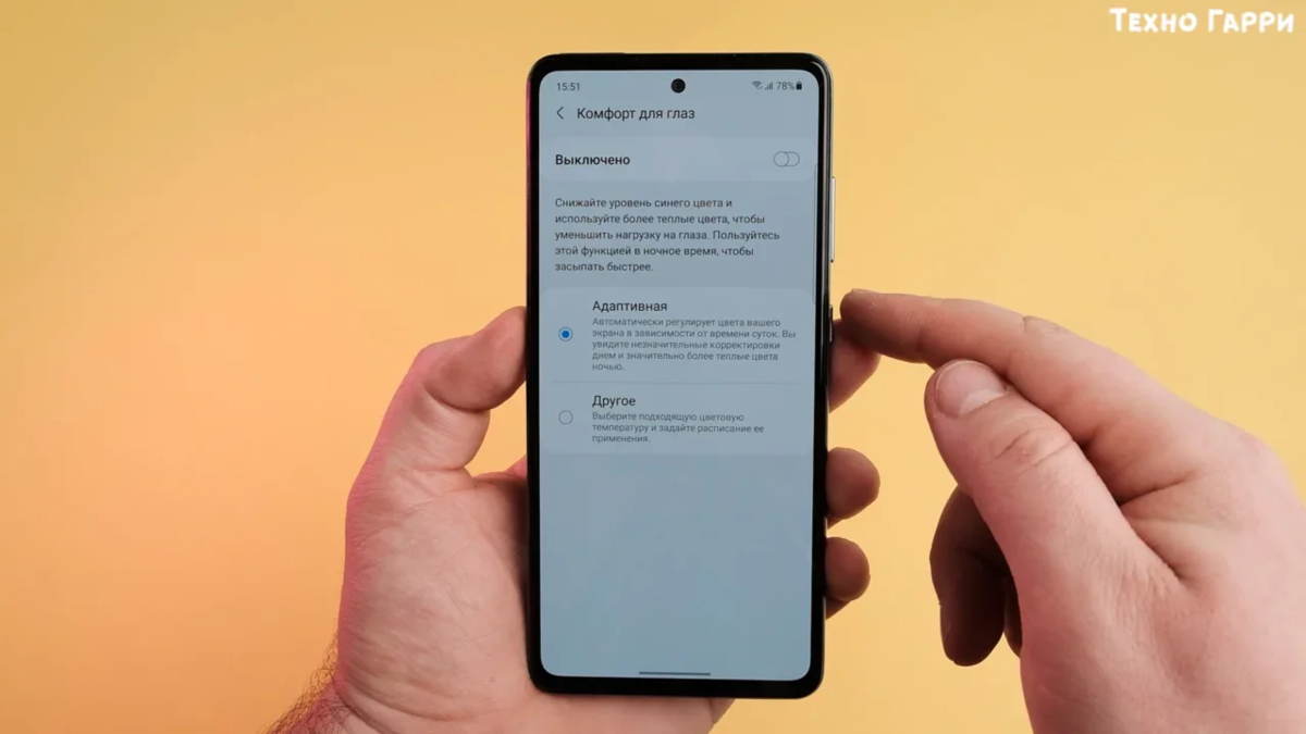 У экрана есть полезная функция «Комфорт для глаз». Смахиваем шторку быстрого меню и находим соответствующий значок. Если мы включим эту функцию, то экран будет излучать меньше синего света, что защити глаза от перегрузки. Можно задать адаптивную регулировку цветовой температуры в зависимости от времени суток, либо же ручную с указанием расписания.