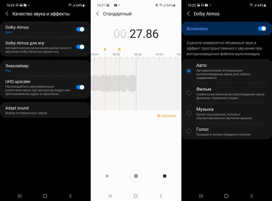 Опции объемного звучания Dolby Atmos, включающие четыре профиля («Авто», «Фильм», «Музыка» и «Голос»), активируются в разделе «Качество звука и эффекты». Там же доступен 9-полосный эквалайзер с шестью пресетами, включая настраиваемый. Функция улучшения качества звука UHQ upscaler активируется только при подключении проводных наушников, для которых на корпусе предусмотрен ответный 3,5-мм аудио-коннектор. Контент из приложения «Звукозапись» сохраняется в формате M4A, а качество записи предварительно настраивается: высокое (256 кбит/с, 48 кГц), среднее (128 кбит/с, 44,1 кГц) или низкое (64 кбит/с, 44,1 кГц).