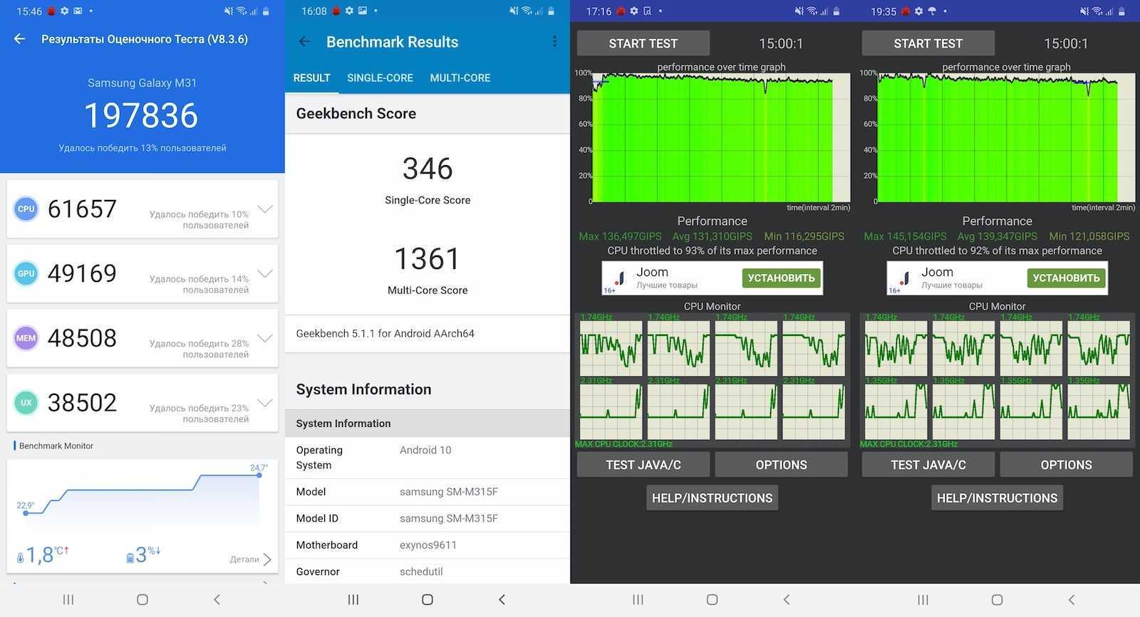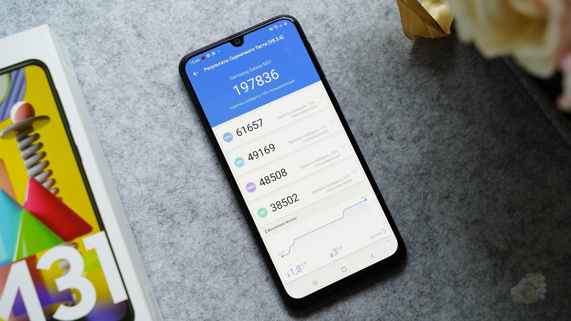Мне понравилась скорость работы телефона, причём не так давно тестировал другие модели M-серии с похожей начинкой. Они работали не так быстро, для меня это стало неожиданным — думал, что в Galaxy M31 используется более производительная начинка, но нет. Возможно, разница в увеличенном объёме оперативки, а может быть, просто оптимизировали работу системы.