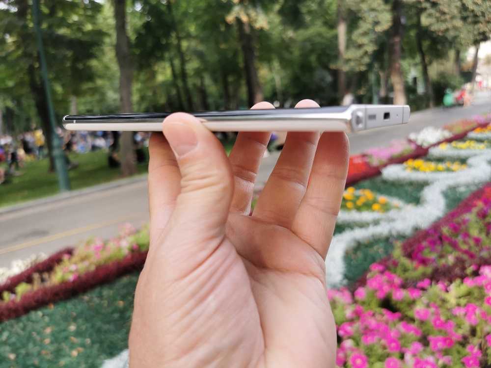 В остальном, дизайн такой же, как обычно: боковой рамки считай нет, оба стекла так сильно закругляются, что почти сходятся «на нет» в боках. Естественно, и рамка, и стёкла очень скользкие, маркие, а нелепые и никому не нужные, но красиво смотрящиеся загибы на стекле экрана лишь дают искажения, отблески света, и вызывают ошибочные нажатия.