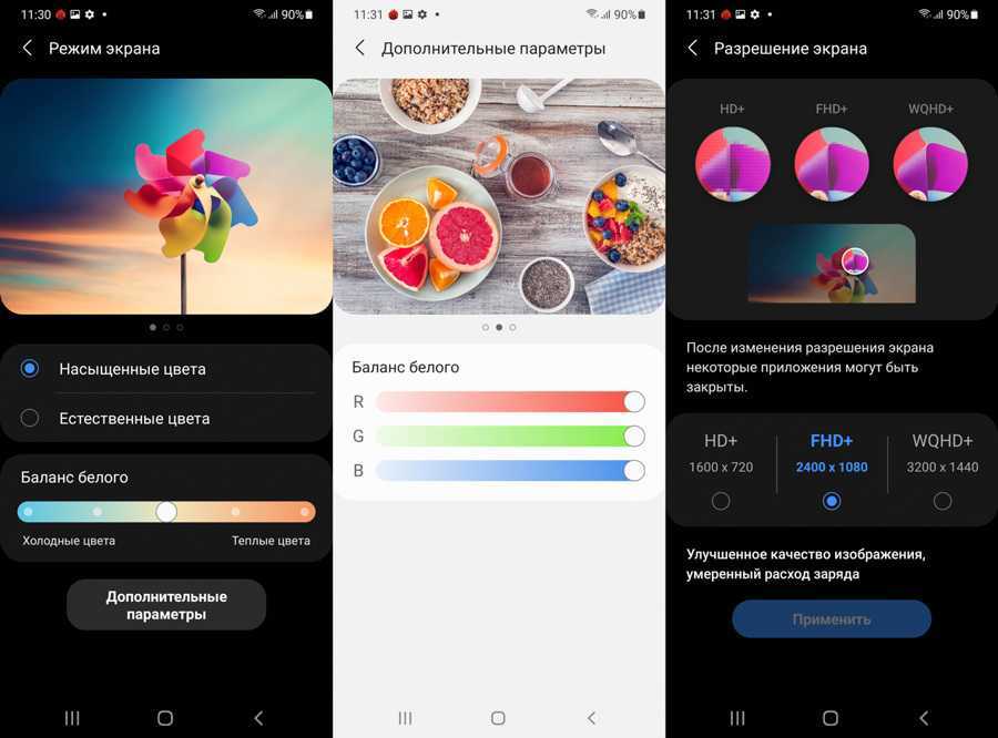 На вкладке «Разрешение экрана» предлагается выбрать одно из трех предлагаемых значений. Так, по умолчанию установлено разрешение FHD+ (2400×1080 точек), для которого обещают улучшенное качество изображения и умеренный расход заряда. При максимальном разрешении WQHD+ (3200×1440 точек) качество картинки будет еще лучше, но и расход заряда окажется максимальным. Соответственно, затраты энергии станут минимальными, а качество изображения стандартным при разрешении HD+ (1600×720 точек). В настройках «Режим экрана» следует выбрать между насыщенными и естественными цветами, а также настроить по необходимости баланс белого, используя дополнительные параметры.